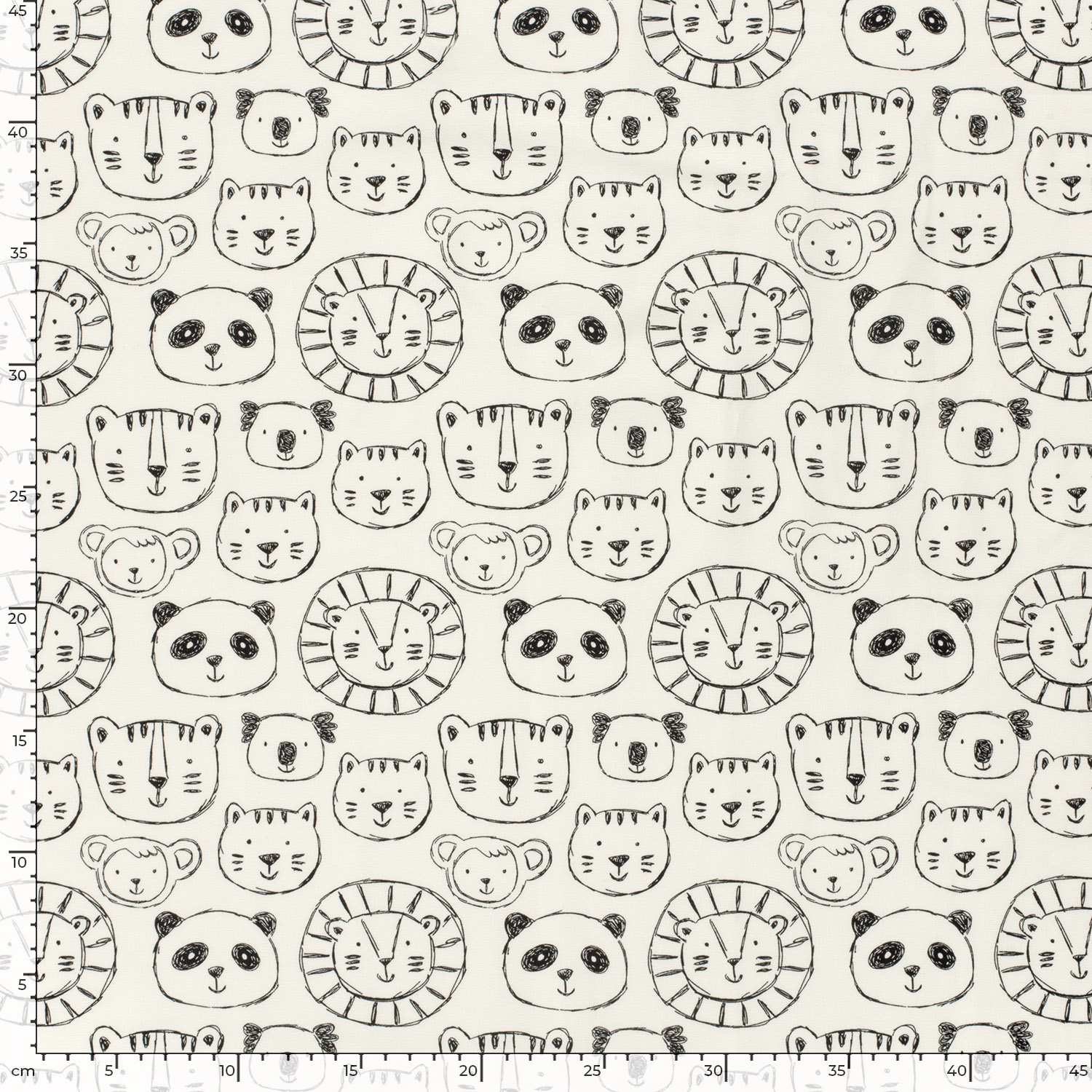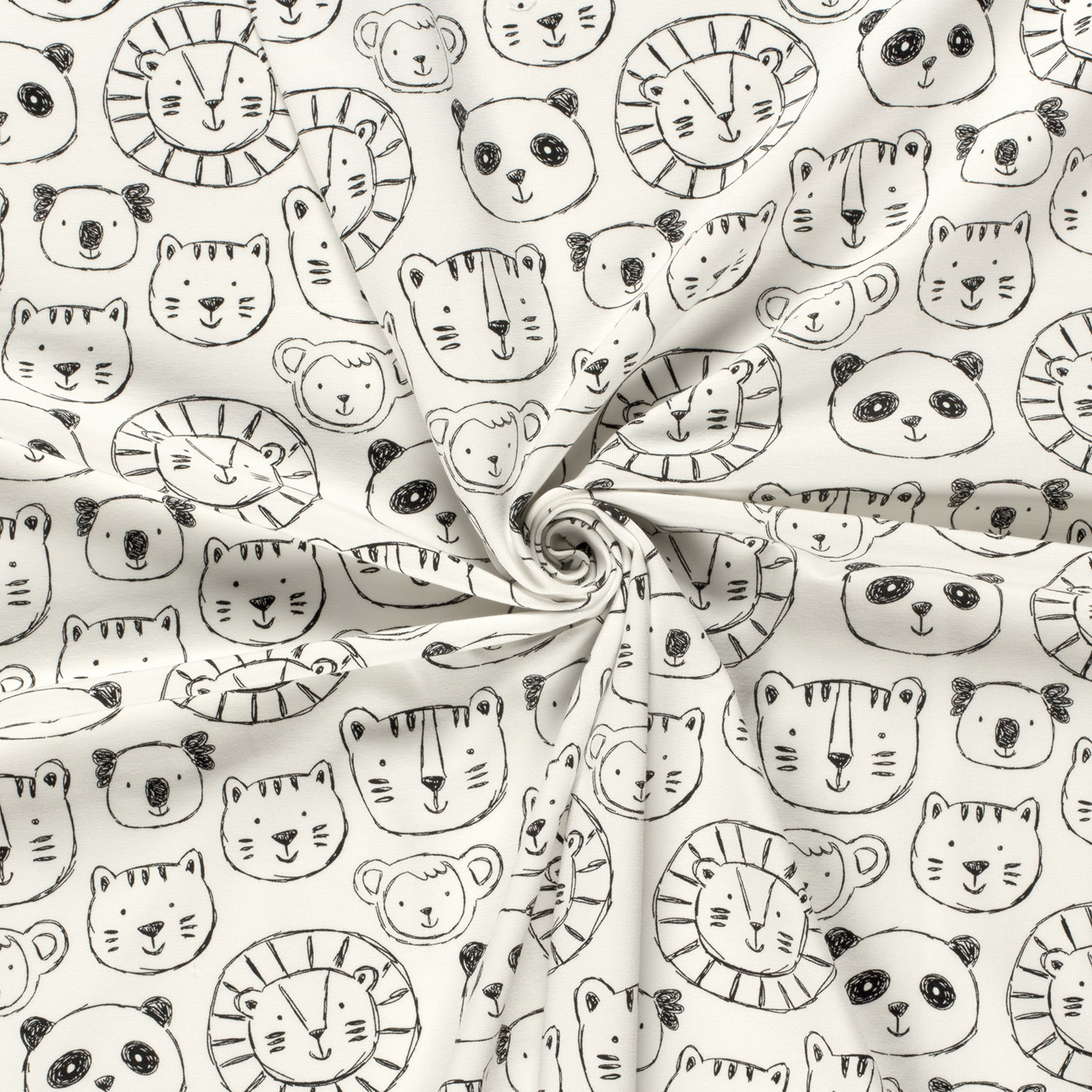 Der Baumwolle Jersey Bio Naturel Stoff bedruckt Safari Tiere in Wollweiß ist ein weicher, elastischer Bio-Baumwolljersey, der sich ideal für bequeme und funktionale Kleidung eignet. Die sanfte, anschmiegsame Qualität sorgt für ein angenehmes Tragegefühl und macht diesen Stoff zu einer hervorragenden Wahl für den Alltag. Das handgezeichnete Safari-Tiere-Motiv mit liebevollen Tiergesichtern verleiht dem Stoff eine verspielte, natürliche und zeitlose Optik.