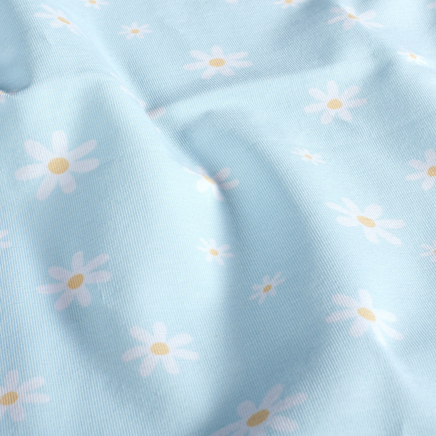 Der Baumwolle Jersey Stoff bedruckt Gänseblümchen in der Farbe Hellblau ist ein angenehm weicher und elastischer Baumwolljersey, der sich ideal für bequeme und alltagstaugliche Kleidung eignet. Durch seine geschmeidige Qualität schmiegt sich der Jerseystoff sanft an den Körper an, ohne einzuengen oder auszuleiern. Das zarte Blumen-Motiv verleiht dem Stoff eine zeitlose, feminine Optik und macht ihn zu einem echten Klassiker.
