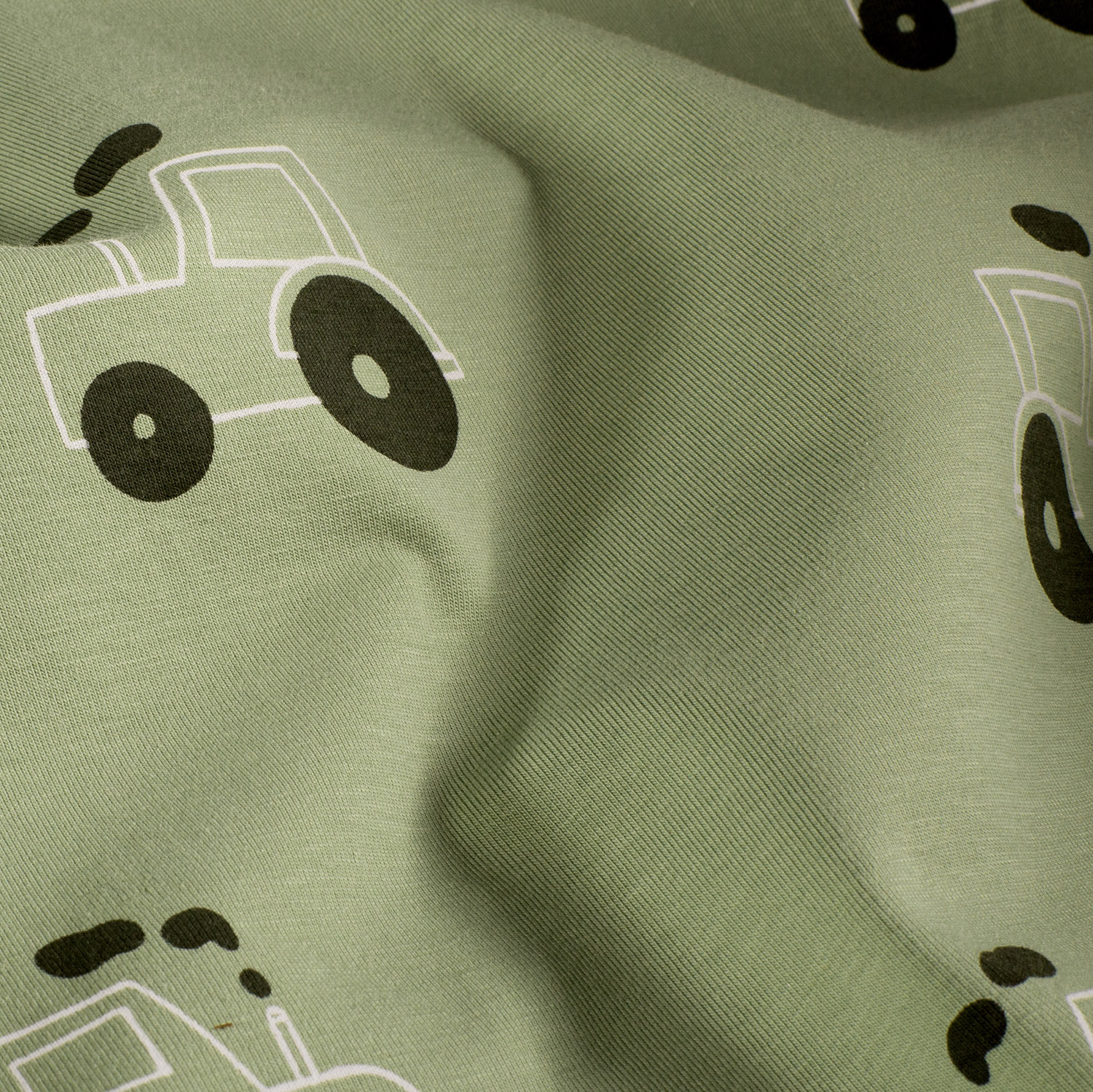 Baumwolle Jersey Stoff bedruckt Traktoren Olivgrün