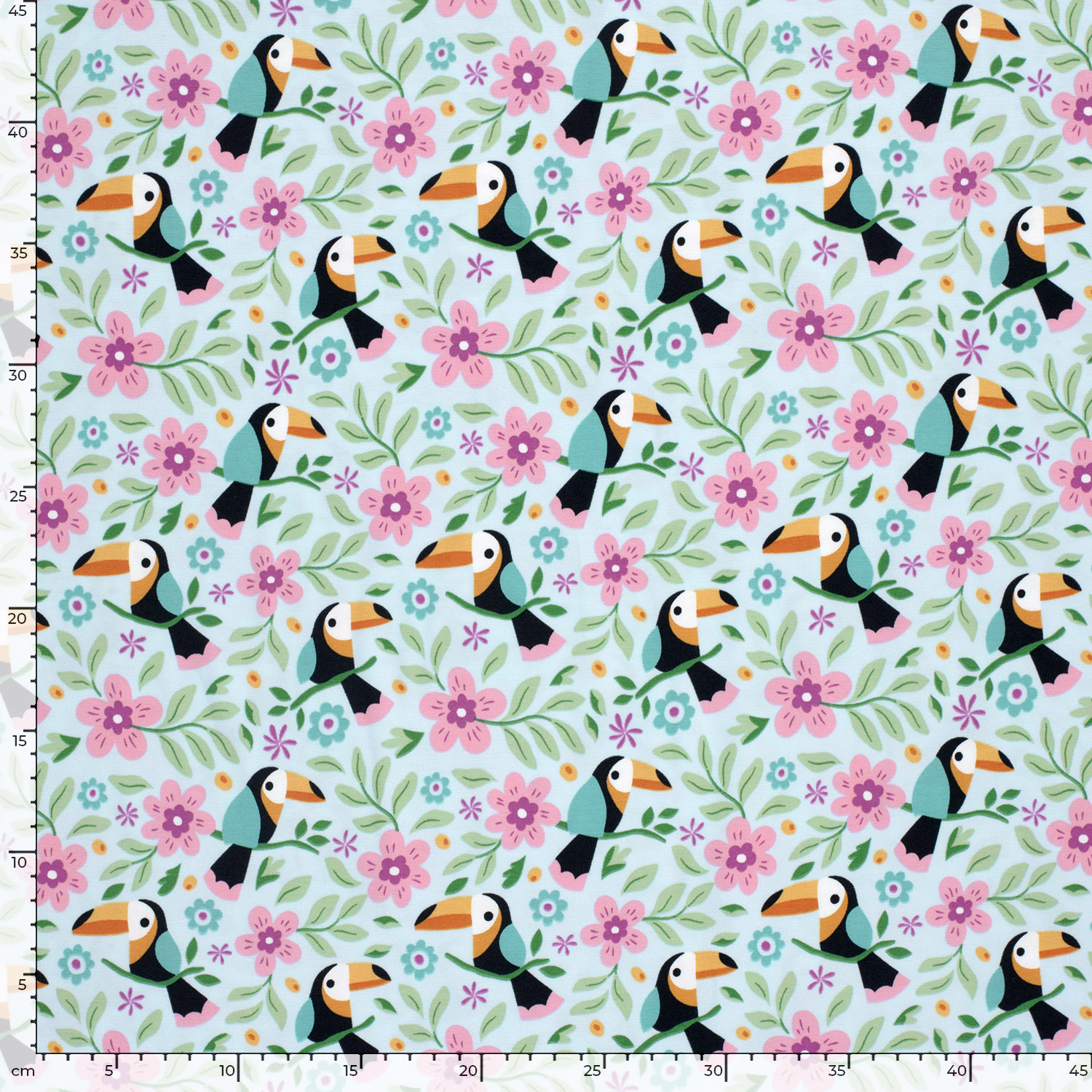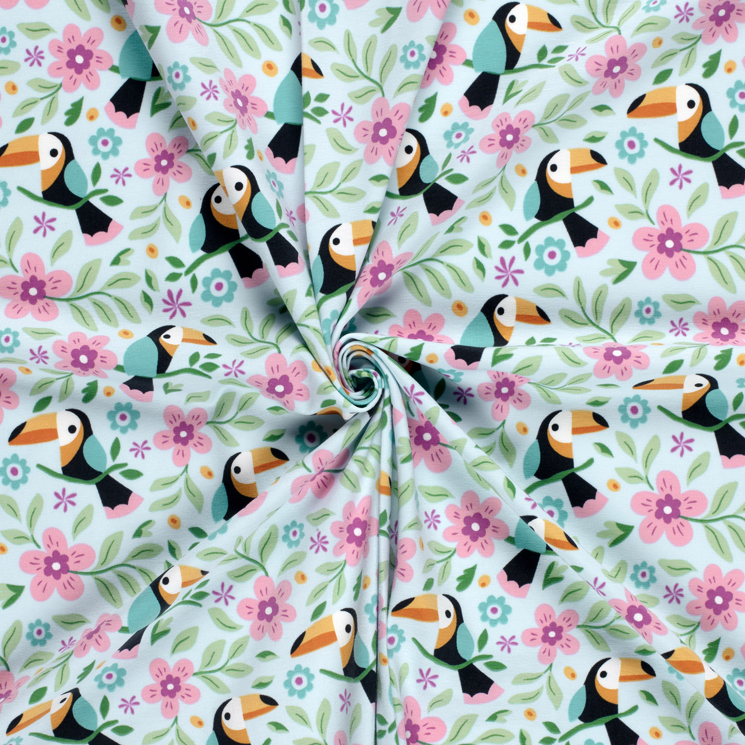 Baumwolle Jersey Stoff bedruckt Tukan und Blumen Hellblau