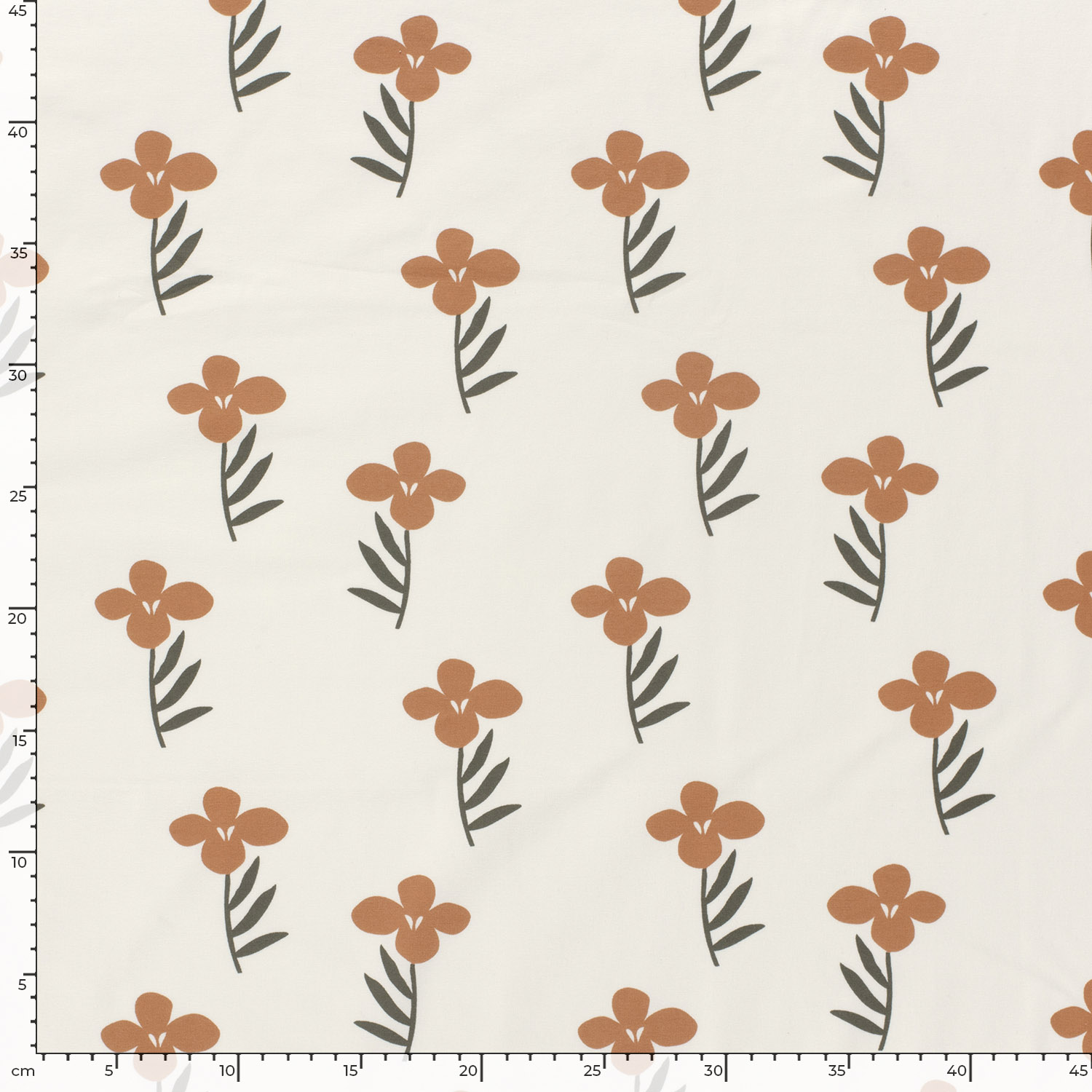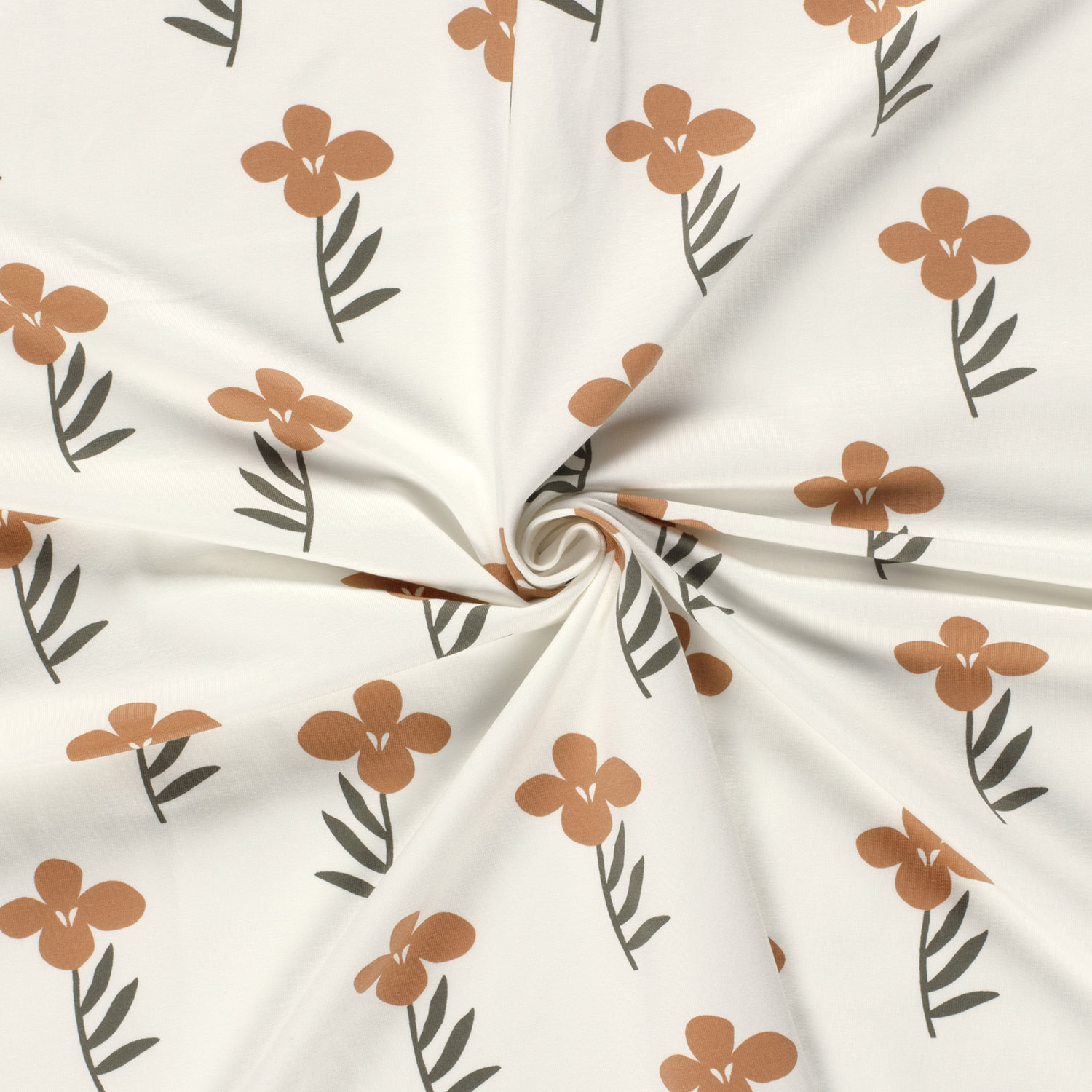 Der Baumwolle Jersey Stoff als Meterware ist pflegeleicht, langlebig und vielseitig kombinierbar. Das Blumen-Design auf wollweißem Hintergrund passt zu vielen Stilrichtungen und lässt sich wunderbar mit Uni-Stoffen kombinieren.