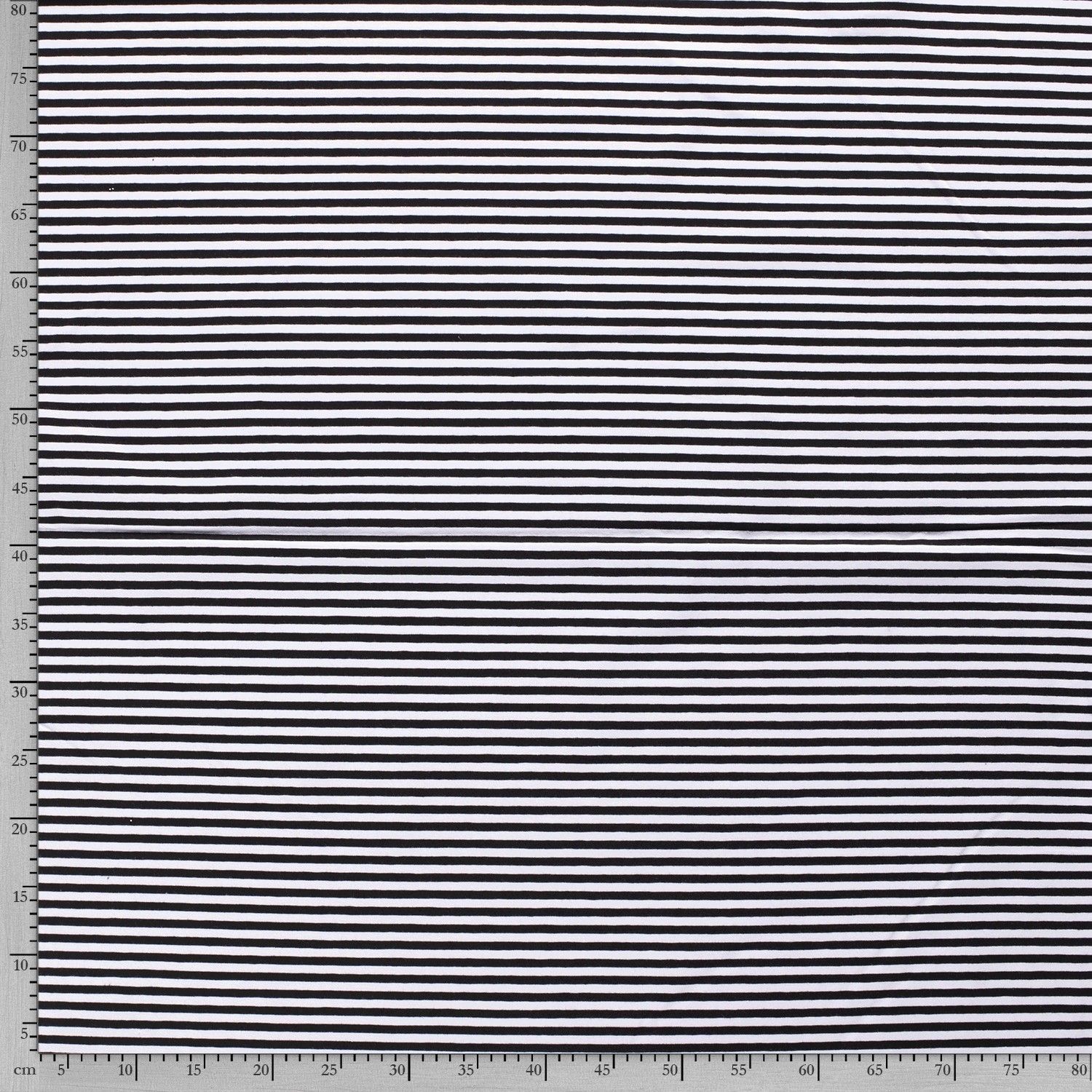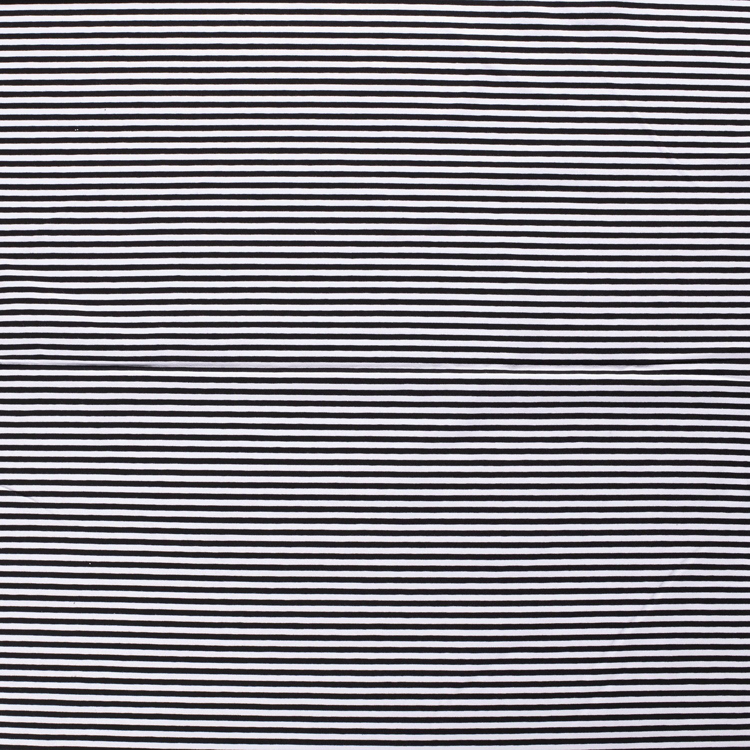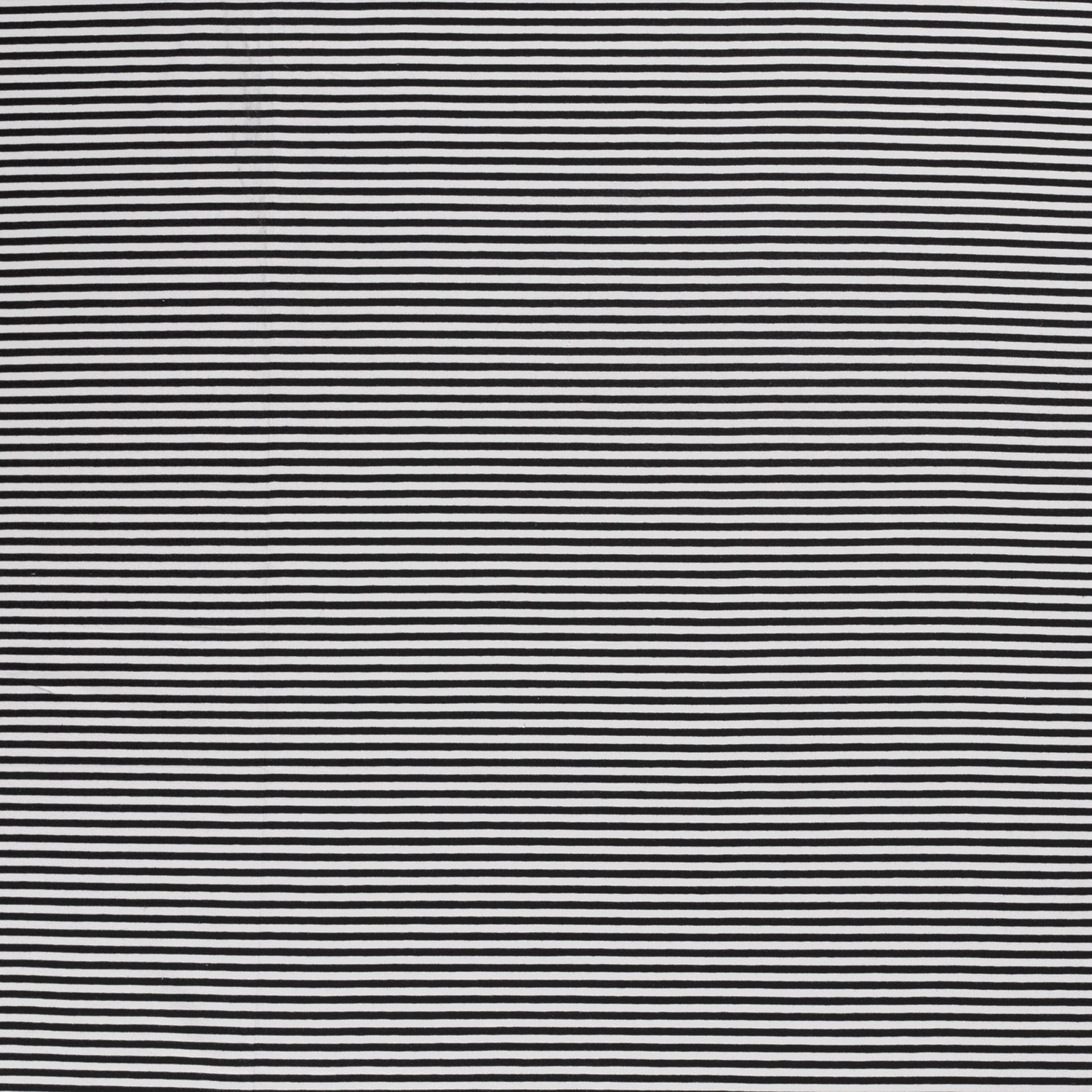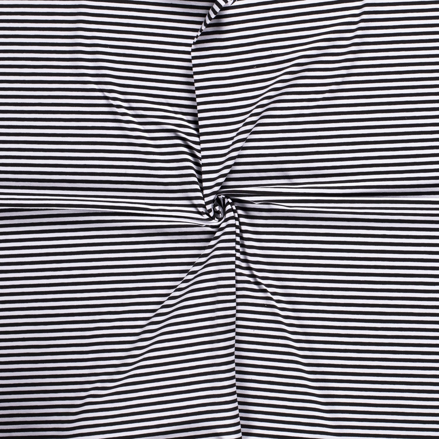 Baumwolljersey ist ein idealer Stoff für Kinder- und Babybekleidung. Er passt sich eng an den Körper an, ist dabei aber gleichzeitig wunderbar elastisch durch den Elasthan-Anteil. Der weiche Stoff ist atmungsaktiv und bietet Bewegungsfreiheit. Der hohe Baumwollanteil des Jersey Stoffs sorgt für ein angenehmes Hautgefühl und sorgt dafür, dass der Stoff leicht zu verarbeiten ist. Das besondere an diesem leichten Jerseystoff ist sein Motiv. Dieses besteht aus feinen, ca 1mm breiten Streifen, welche dem Stoff seine besondere Optik verleihen. Damit ihrem nächsten Nähvorhaben mit diesem gestreiften Baumwolljersey Stoff nichts mehr im Wege steht, haben wir für Sie einen farblich passenden Bündchenstoff mit dem selben Motiv für Sie im Sortiment. Dieser ist ein optimaler Abschluss für T-Shirts oder Kleider aus Jerseystoff. Baumwolljersey in verschiedenen Varianten finden Sie im Onlineshop unseres Familienunternehmens!