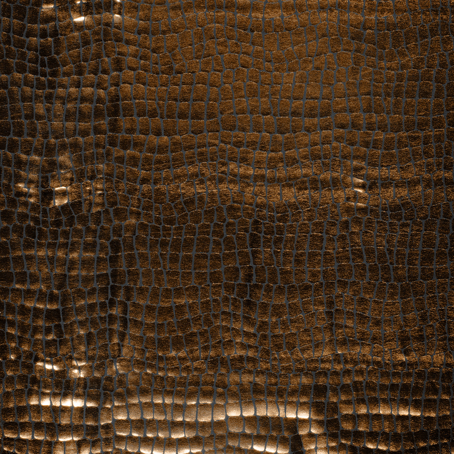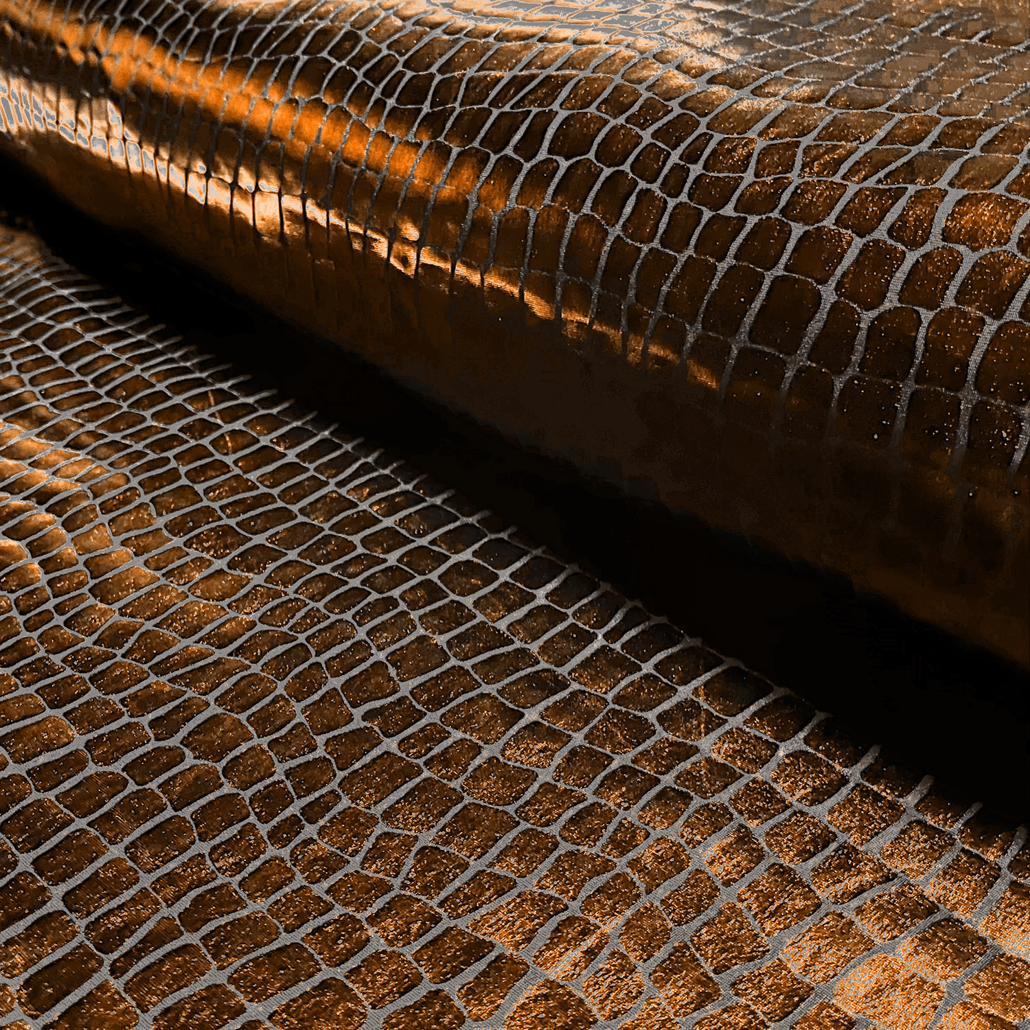 Mit seiner einzigartigen Oberfläche, die an die elegante Textur von Alligatorhaut erinnert und gleichzeitig mit einem schillernden Folienglanz veredelt ist, wird dieser Stretch Stoff zum absoluten Highlight Ihrer Garderobe oder Dekoration. Die Bronze Farbe verleiht ihm eine zeitlose Eleganz, die sowohl klassisch als auch modern interpretiert werden kann und eine warme, reiche Ausstrahlung besitzt. Jeder Lichteinfall lässt den Folie Stoff anders schimmern, wodurch dynamische Effekte entstehen, die Ihre Kreationen lebendig wirken lassen.