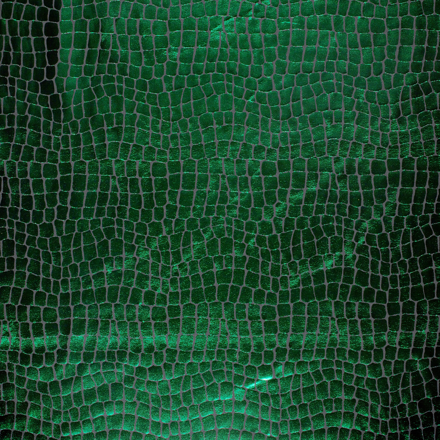 Unser Stretch Foil Alligator Lamé ist ein Meisterwerk der Stoffkunst. Die Basis bildet ein hochwertiges Lamé, das für seinen metallischen Glanz und seine luxuriöse Ausstrahlung bekannt ist. Doch dieser Stoff geht noch einen Schritt weiter: Eine aufwendige Folienbeschichtung im Alligator Muster verleiht ihm eine faszinierende, dreidimensionale Oberfläche, die bei jeder Bewegung das Licht einfängt und ein dynamisches Spiel aus Schimmer und Schatten erzeugt. Die intensive grüne Farbe ist tief und satt, wirkt edel und geheimnisvoll zugleich, und harmoniert perfekt mit dem funkelnden Folien-Effekt. Es ist ein Grün, das an smaragdgrüne Edelsteine oder die Tiefen eines tropischen Dschungels erinnert – voller Leben und Energie.