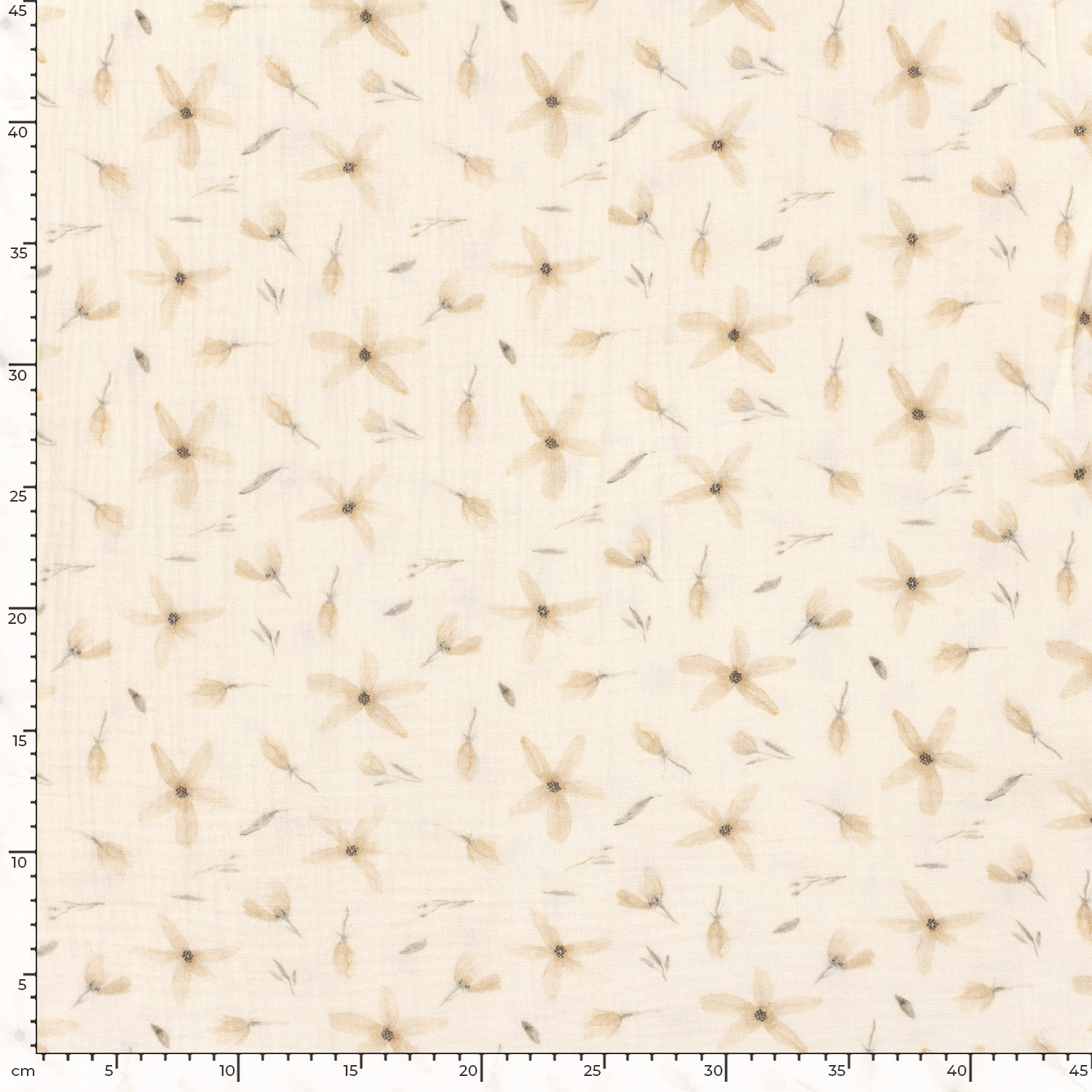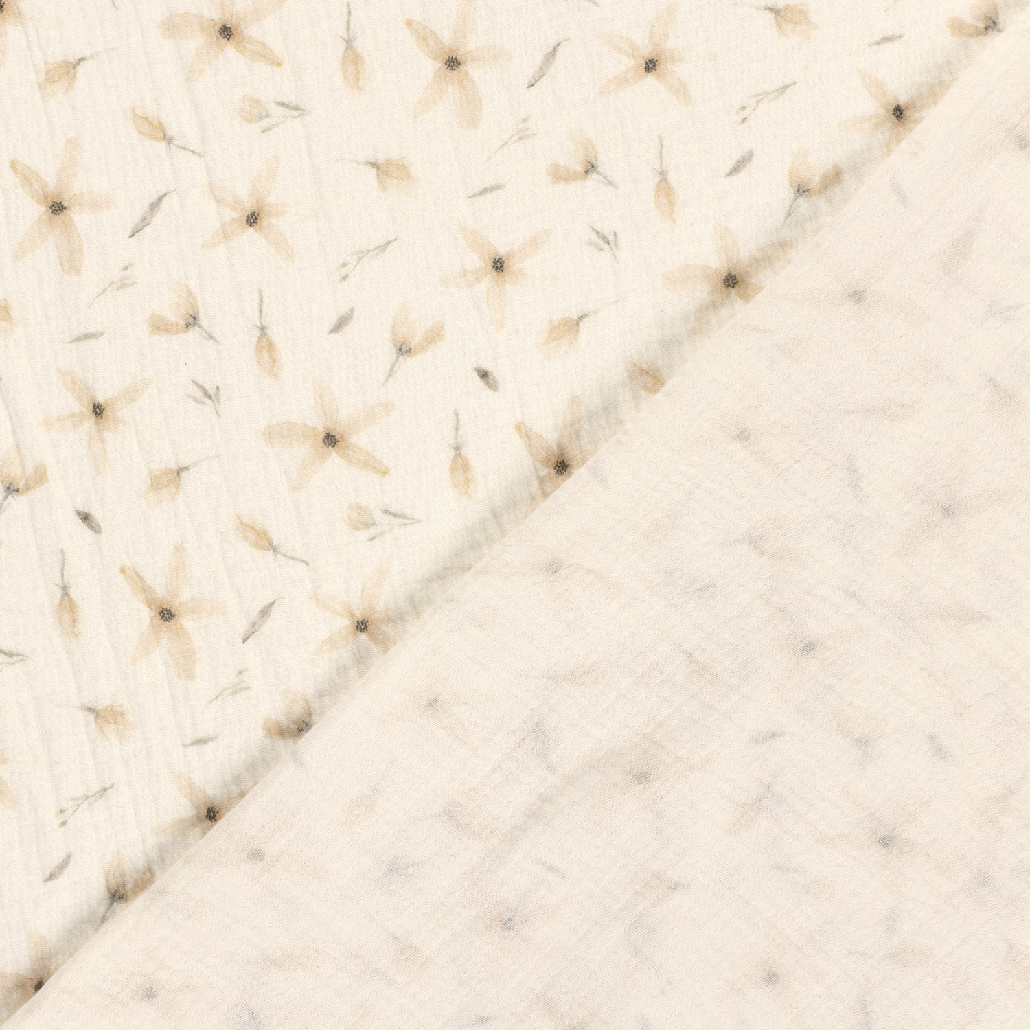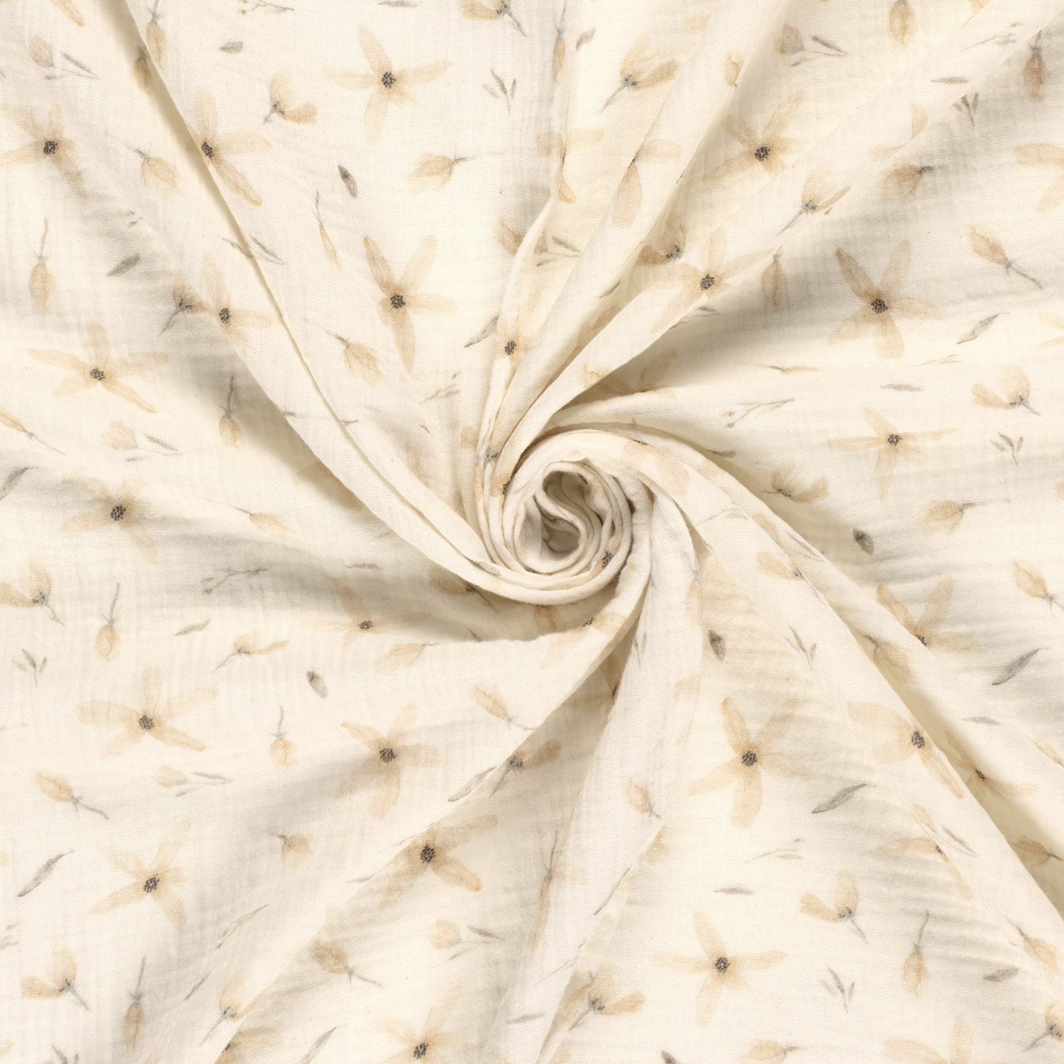 Musselin Stoff bedruckt mit Blüten und Blättern – wollweiß | Baumwollstoff Double Gauze