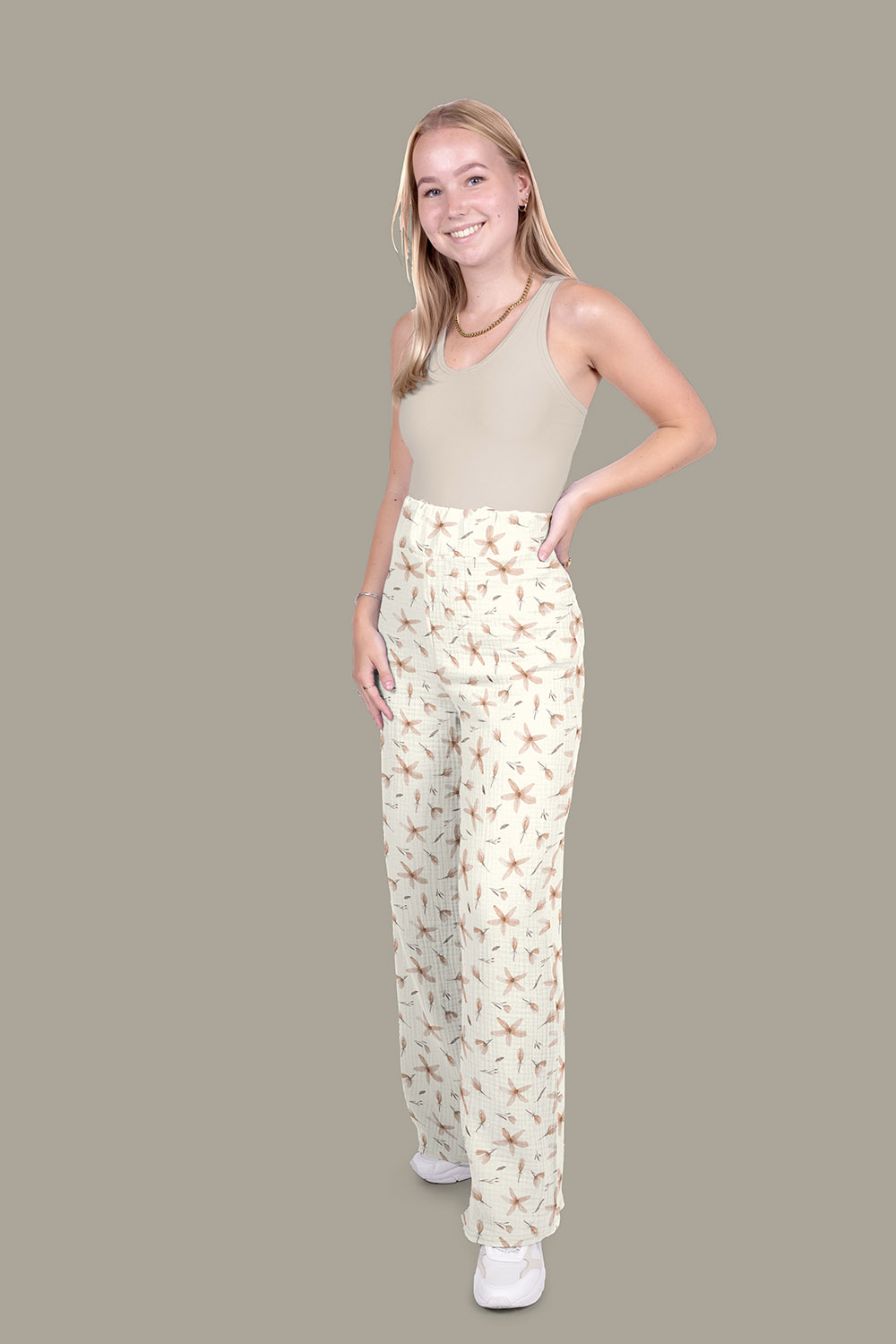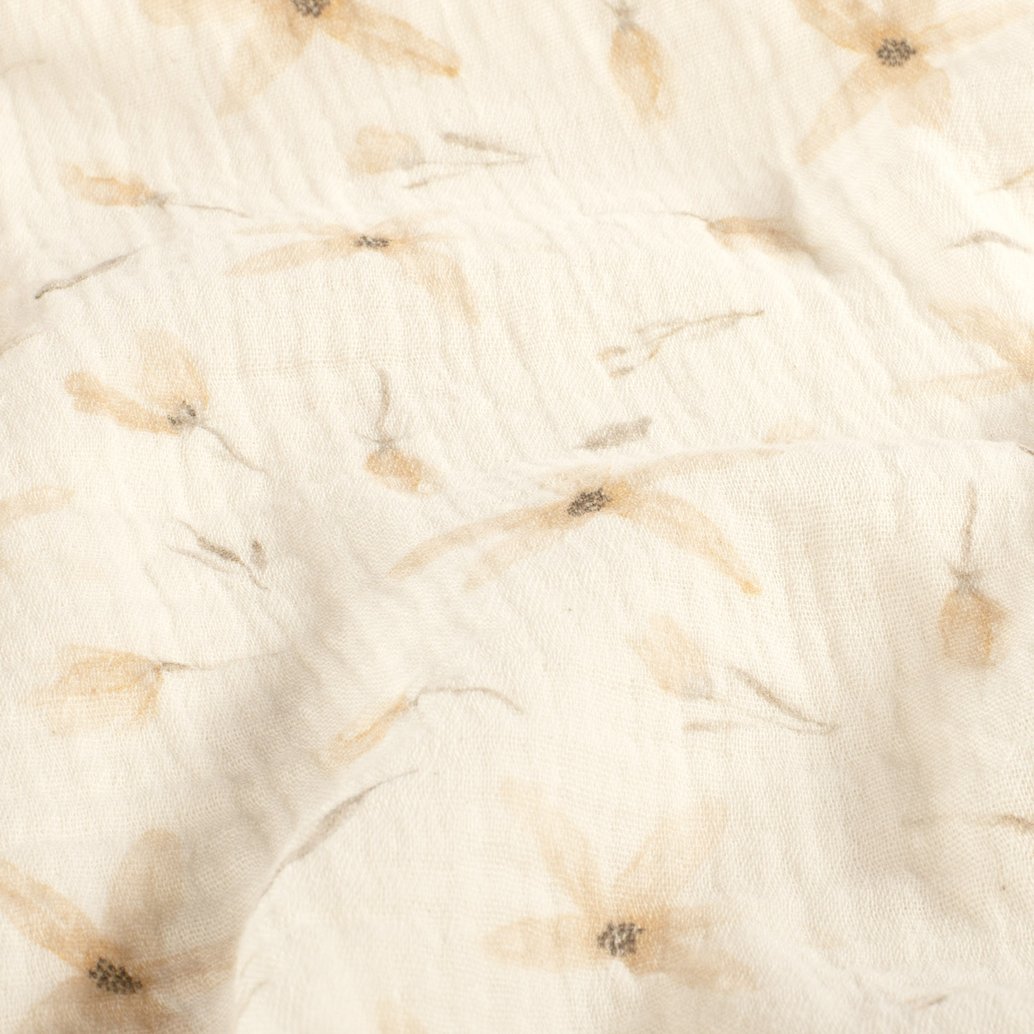 Dieser hochwertige Musselin Stoff (Double Gauze) in der Farbe Wollweiß mit zartem Blüten-Motiv überzeugt durch seine weiche Haptik, hohe Qualität und vielseitige Einsatzmöglichkeiten. Musselin ist ein leichter, feiner Baumwollstoff, der aus zwei locker miteinander verbundenen Gewebelagen besteht. Dadurch ist er besonders atmungsaktiv, hautfreundlich und angenehm zu tragen.