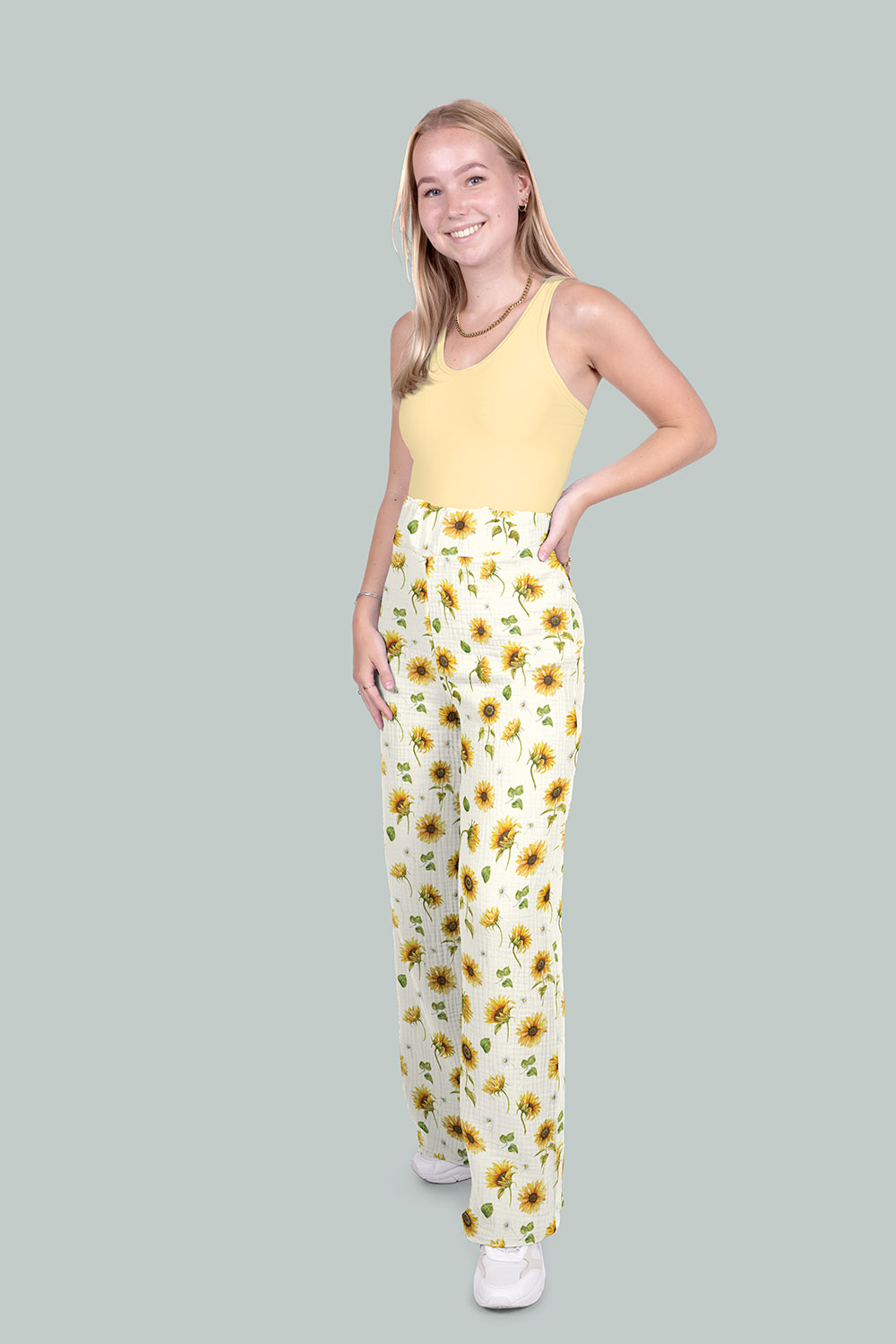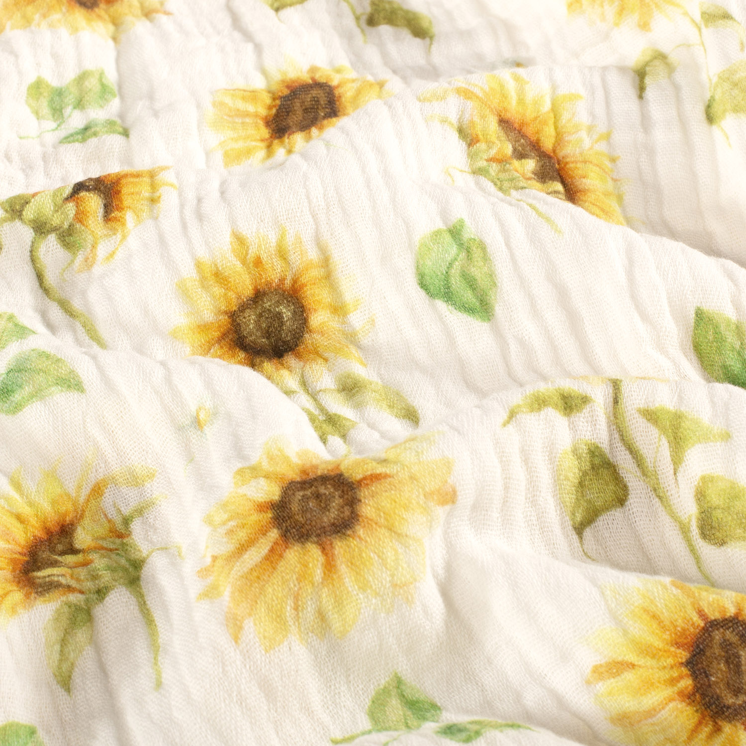 Dieser hochwertige Musselin Stoff (Double Gauze) mit zartem Sonnenblumen-Motiv in der Farbe Wollweiß überzeugt durch seine besonders weiche Haptik, hohe Qualität und vielseitige Einsatzmöglichkeiten. Musselin ist ein leichter, feiner Baumwollstoff, der aus zwei locker miteinander verbundenen Stofflagen besteht. Diese spezielle Webart macht den Stoff atmungsaktiv, hautfreundlich und angenehm zu tragen.