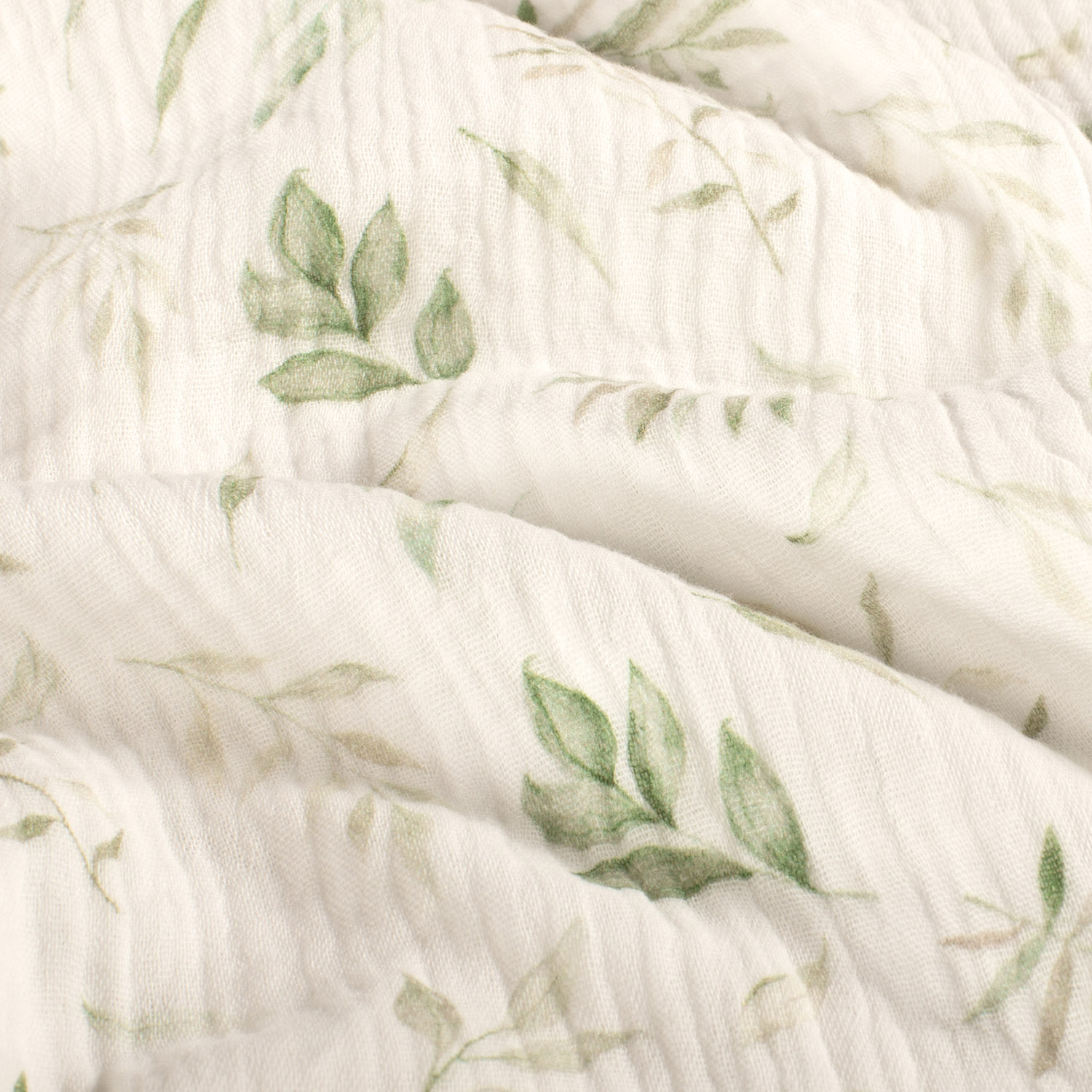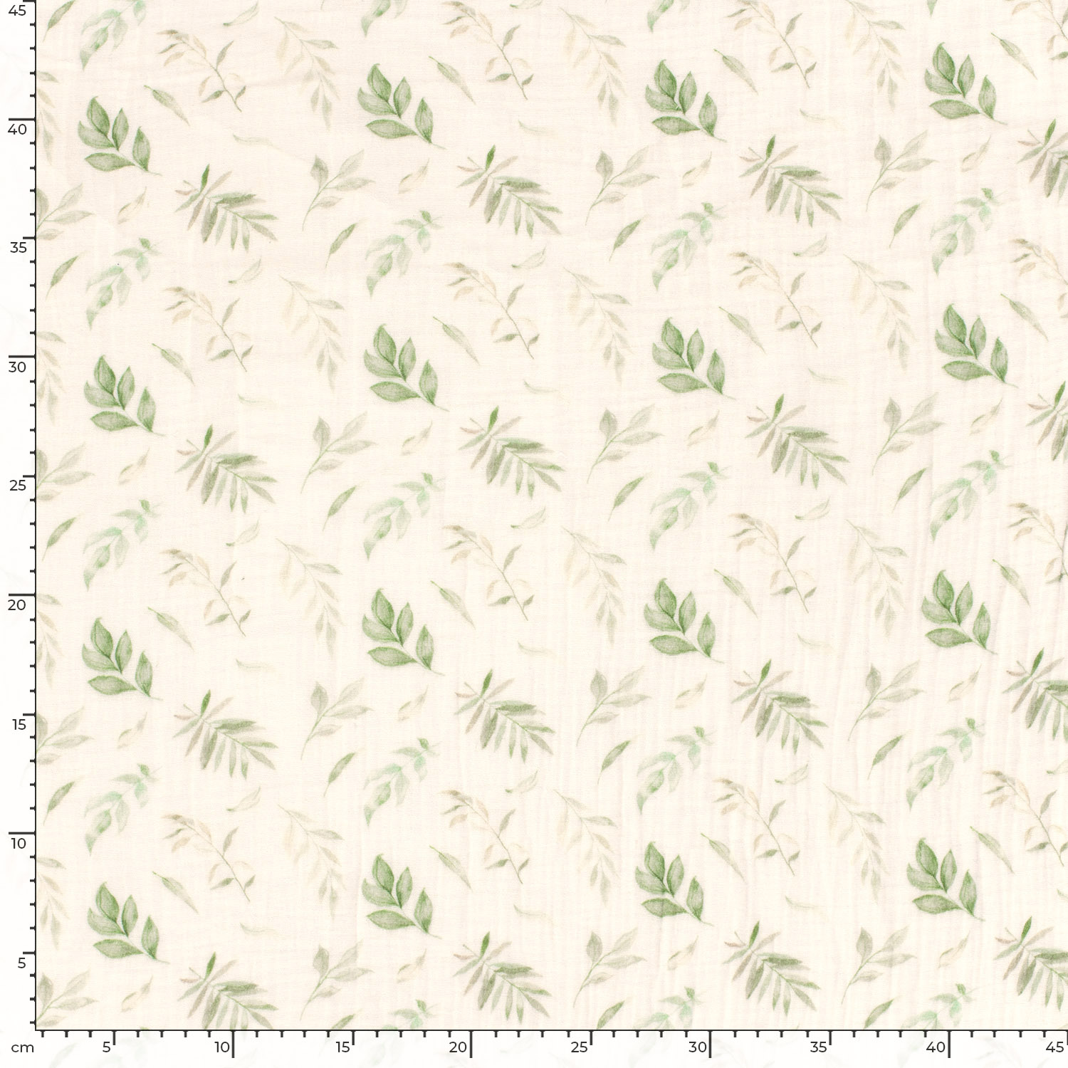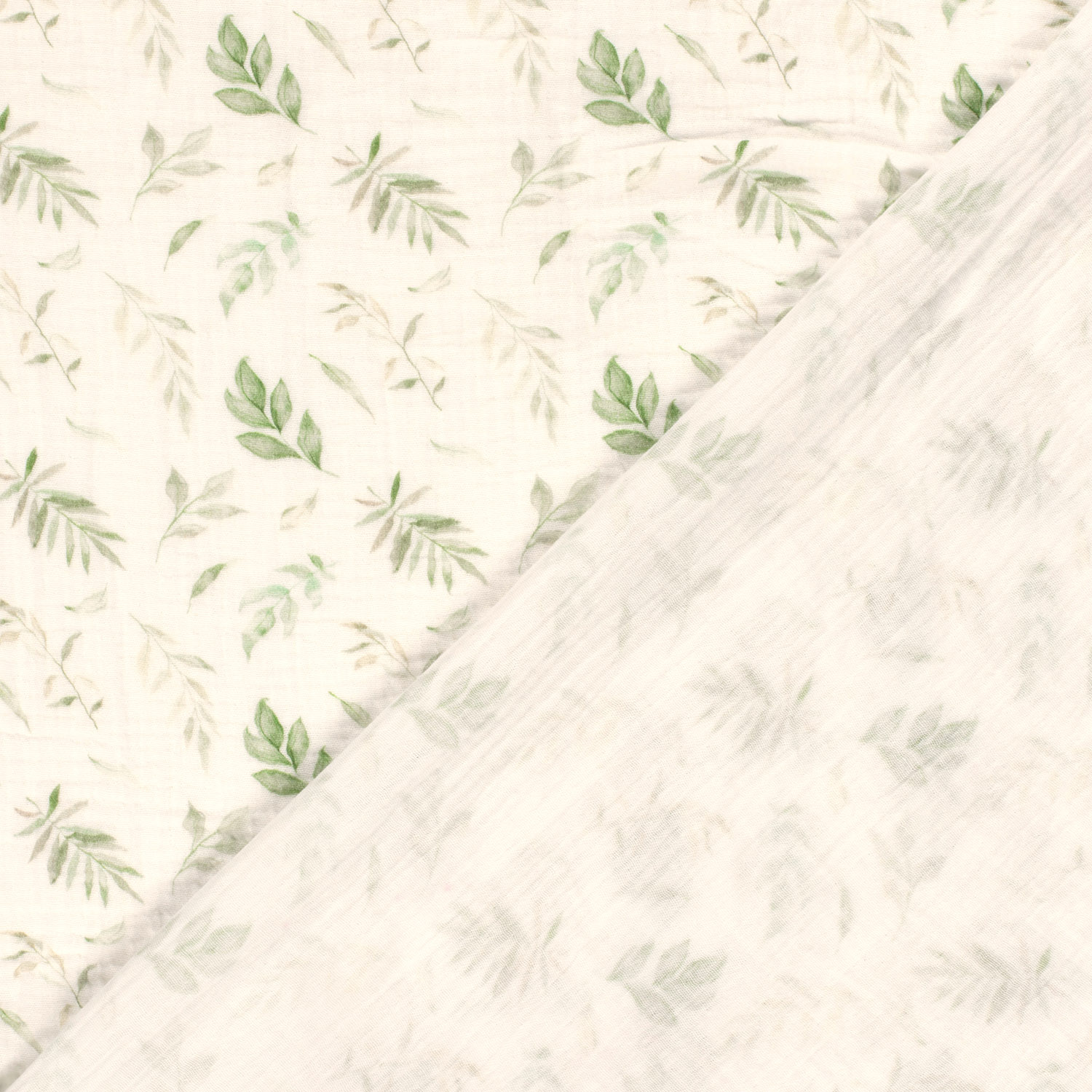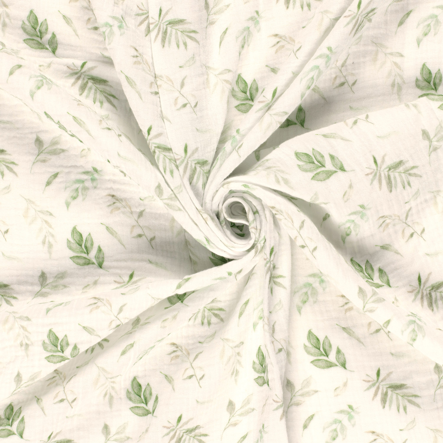 Musselin Stoff bedruckt mit grünen Blättern – wollweiß | Baumwollstoff Double Gauze