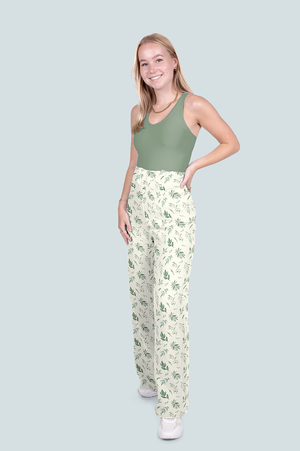 Produktinformationen "Musselin Stoff bedruckt mit grünen Blättern – wollweiß Kopie"