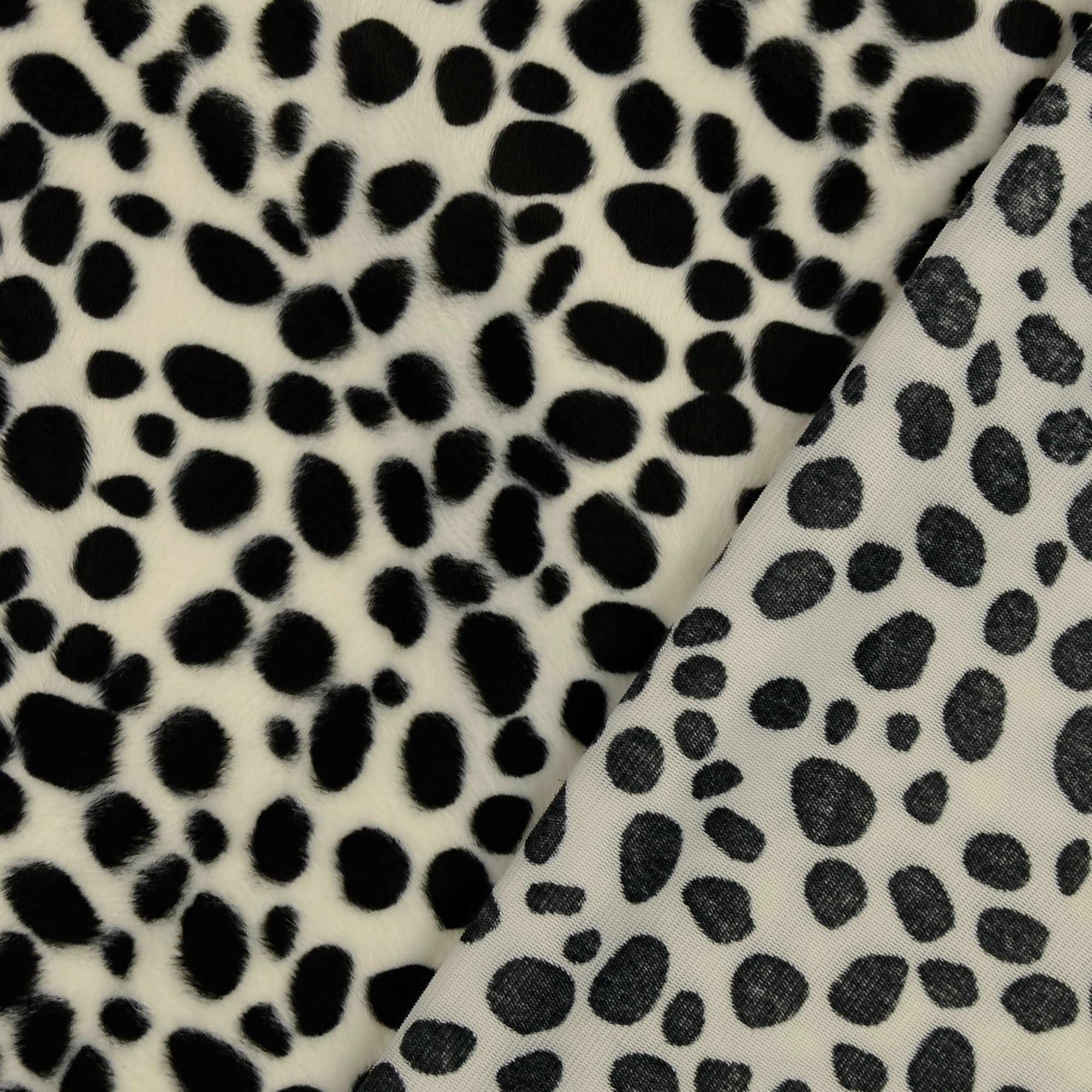 Exklusives Tierfellimitat mit kurzem Flor im Dalmatiner-Look. Ideal für ausgefallene Modekreationen, Karnevalskostüme und Wohndekorationen wie beispielsweise Kissen und Decken!