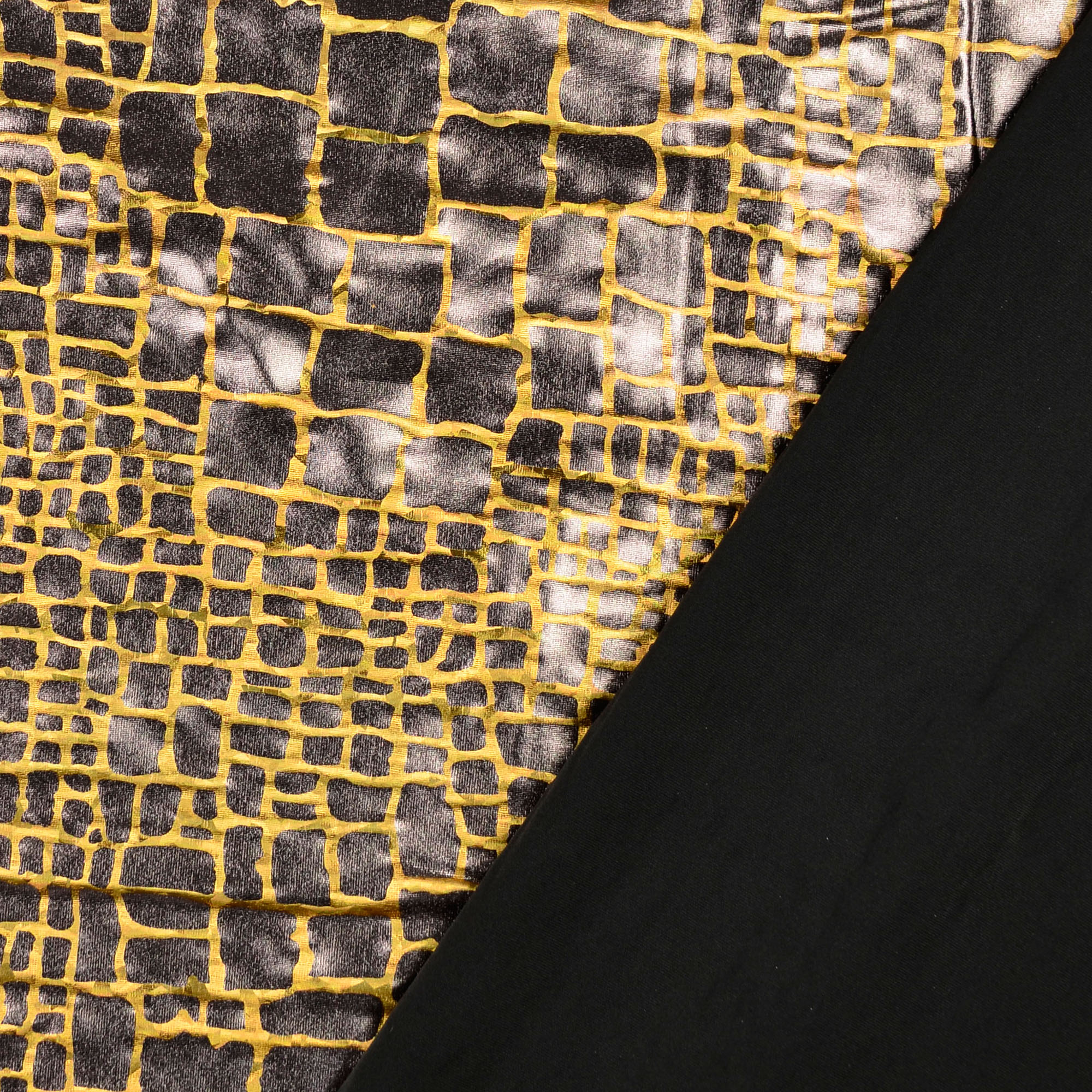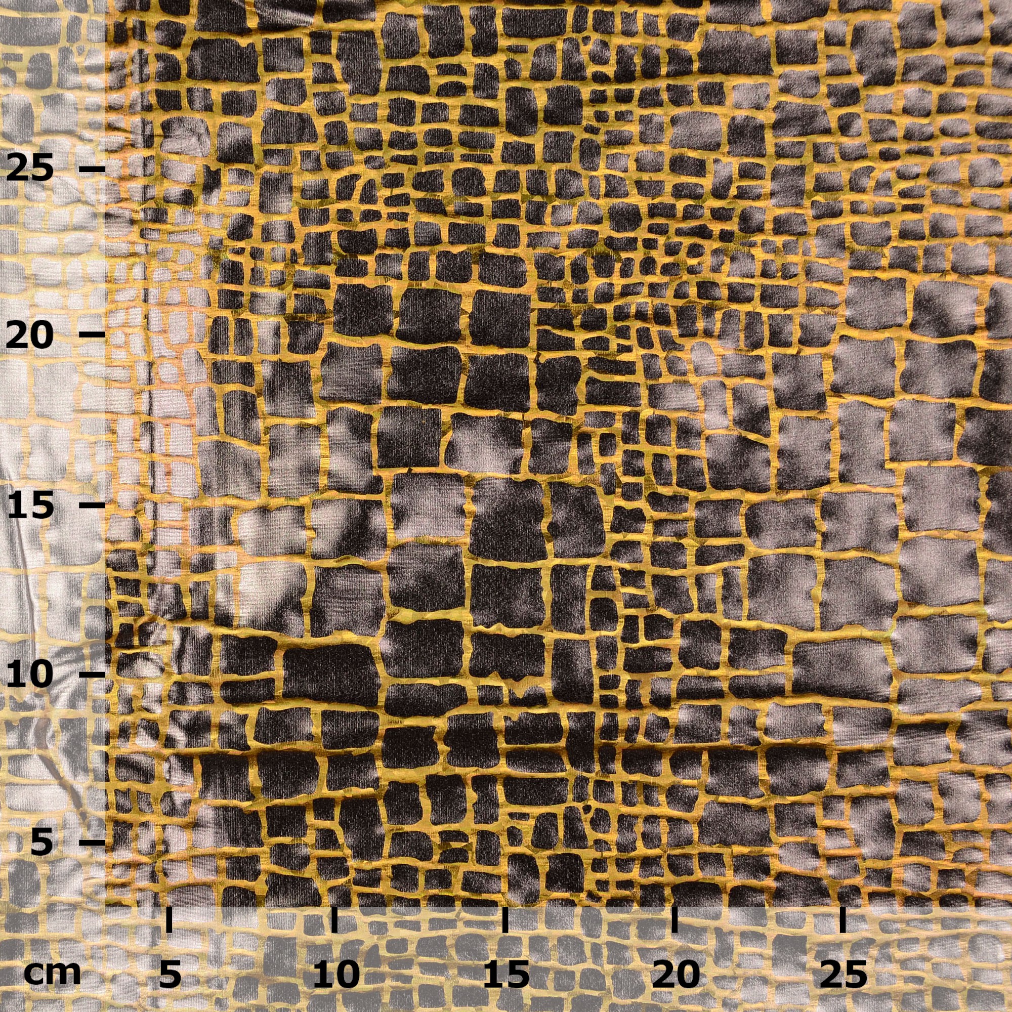 Weichfallender elastischer Folienjersey in Krokodillederoptik.Durch den Elasthan-Anteil ist der Stoff ideal für enganliegende Bekleidung für besondere Anlässe. Außerdem eignet sich der elastische Folienjersey für Karnevalskostüme und sorgt garantiert für glanzvolle Auftritte! Der Stoff ist vielseitig verwendbar.