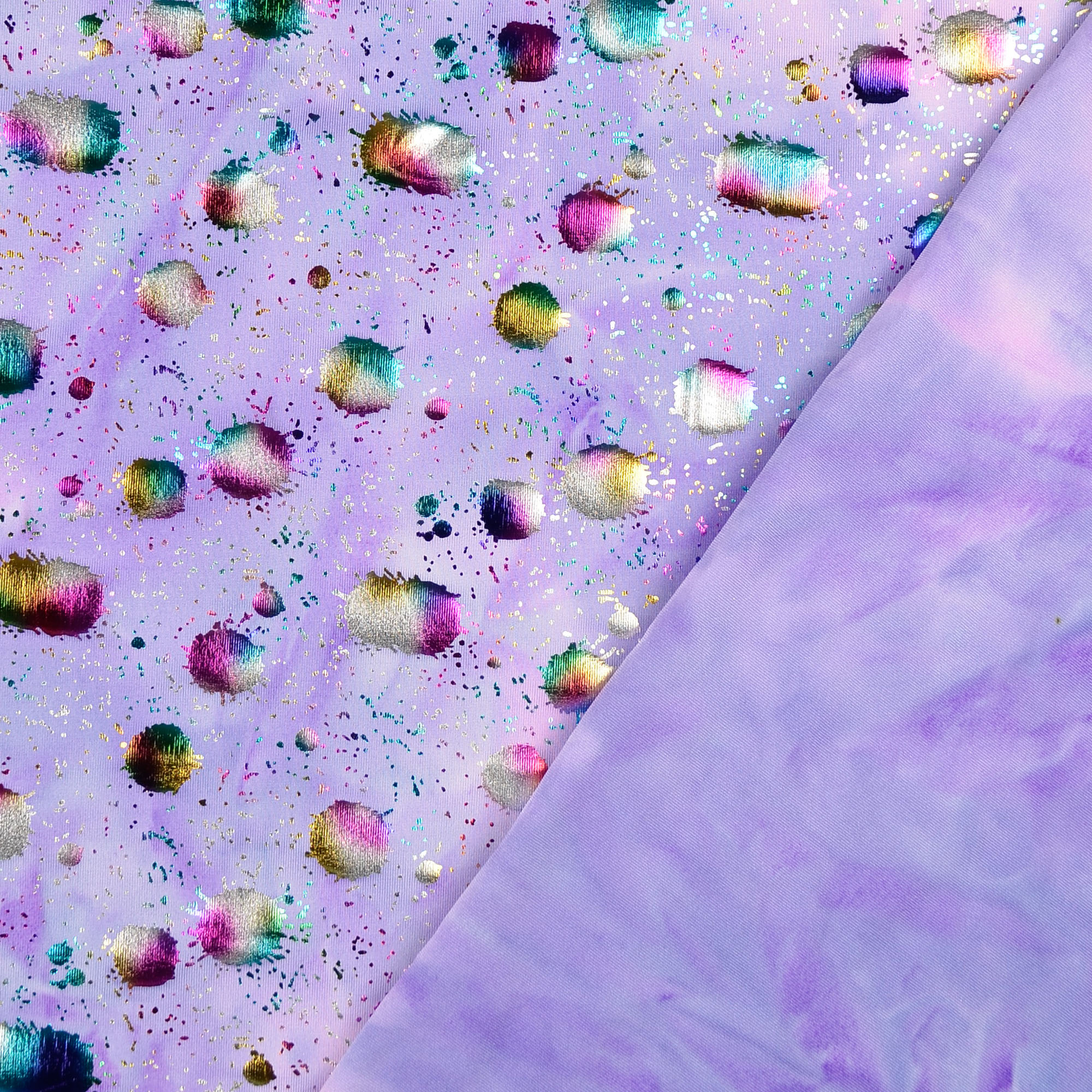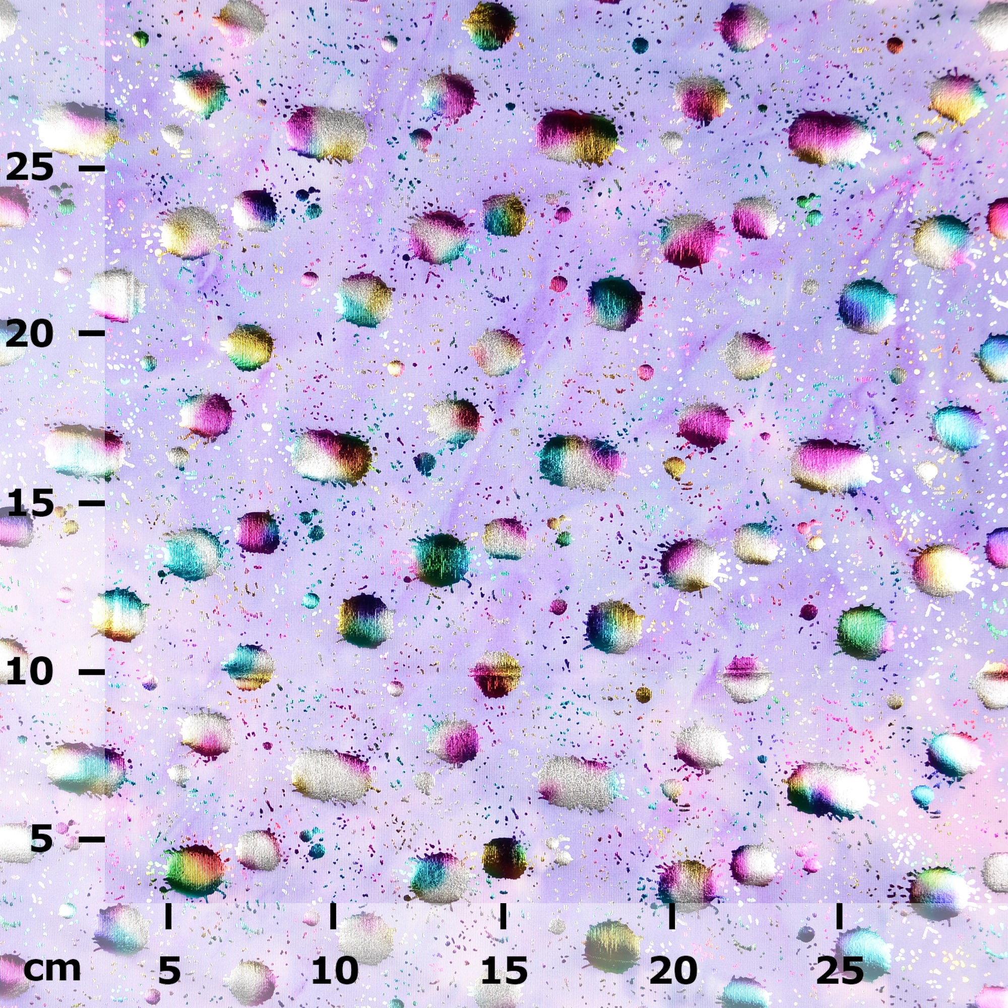 Dieser Stoff bringt Sie zum Scheinen!Weichfallender elastischer Folienjersey mit bunten Tropfen auf lila Hintergrund in Batik-Optik.