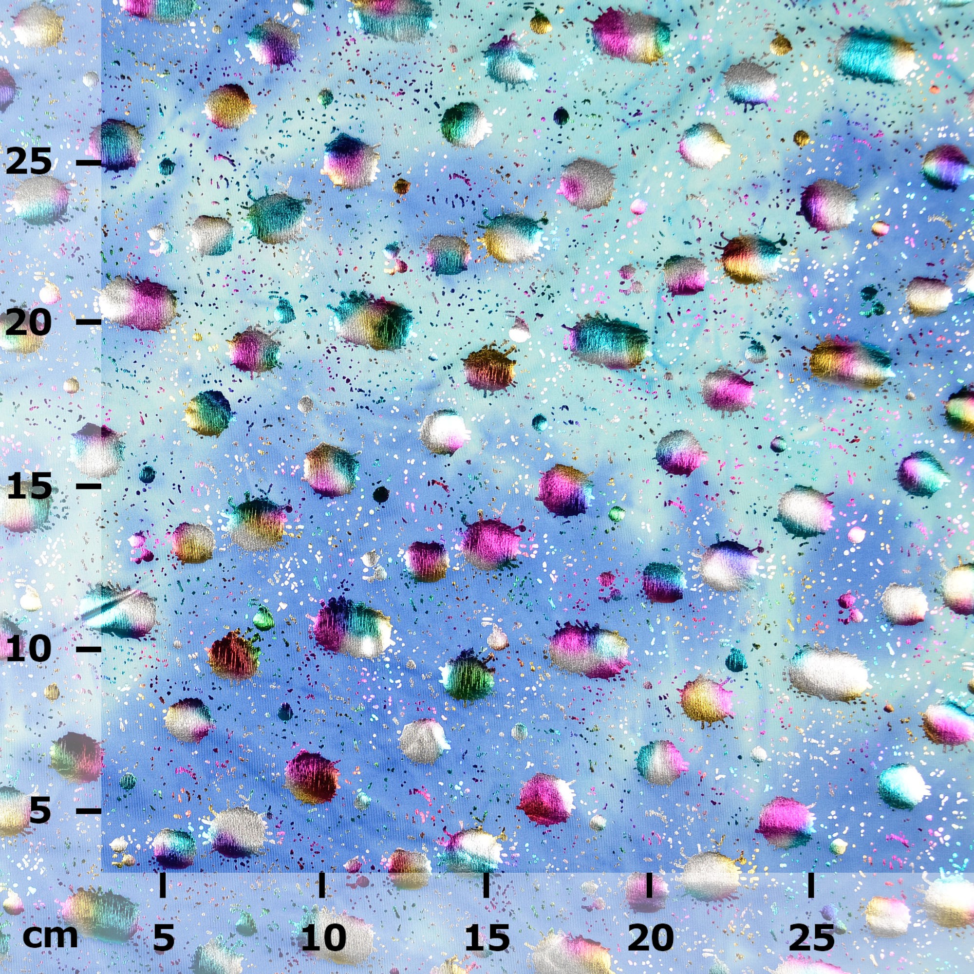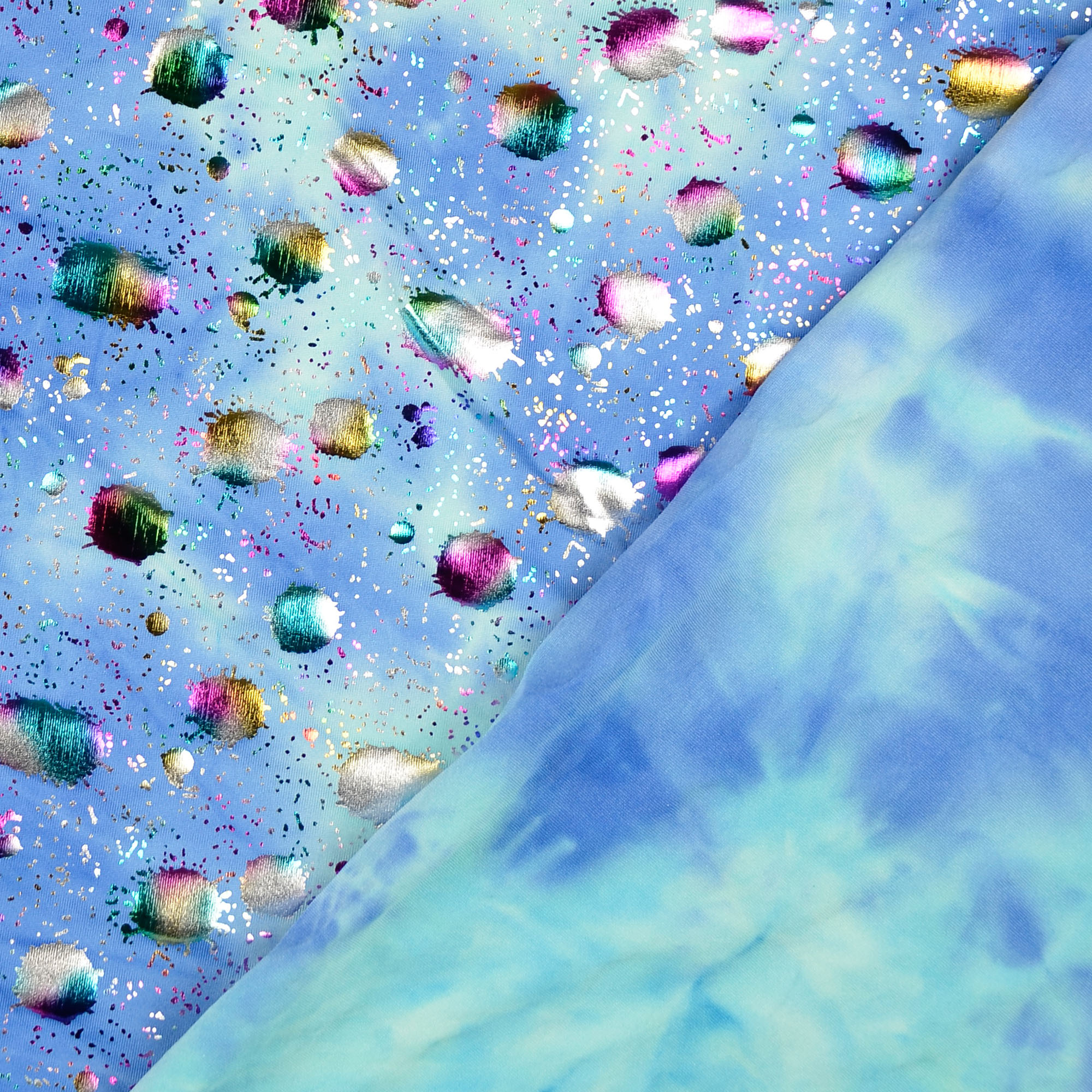 Dieser Stoff bringt Sie zum Scheinen!Weichfallender elastischer Folienjersey mit bunten Tropfen auf blauem Hintergrund in Batik-Optik.