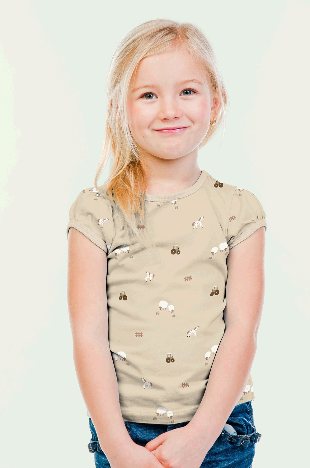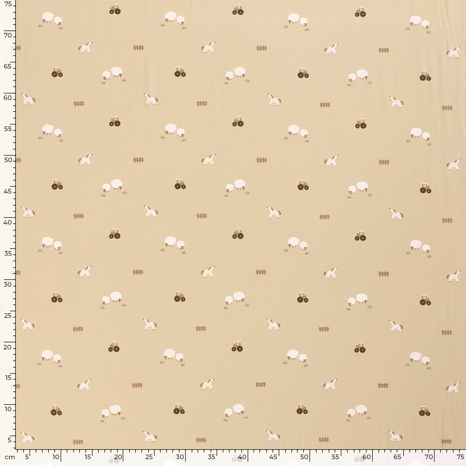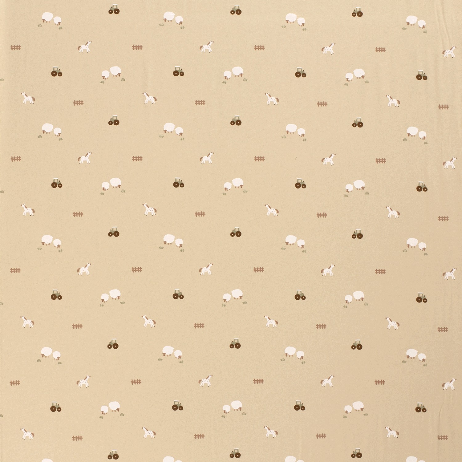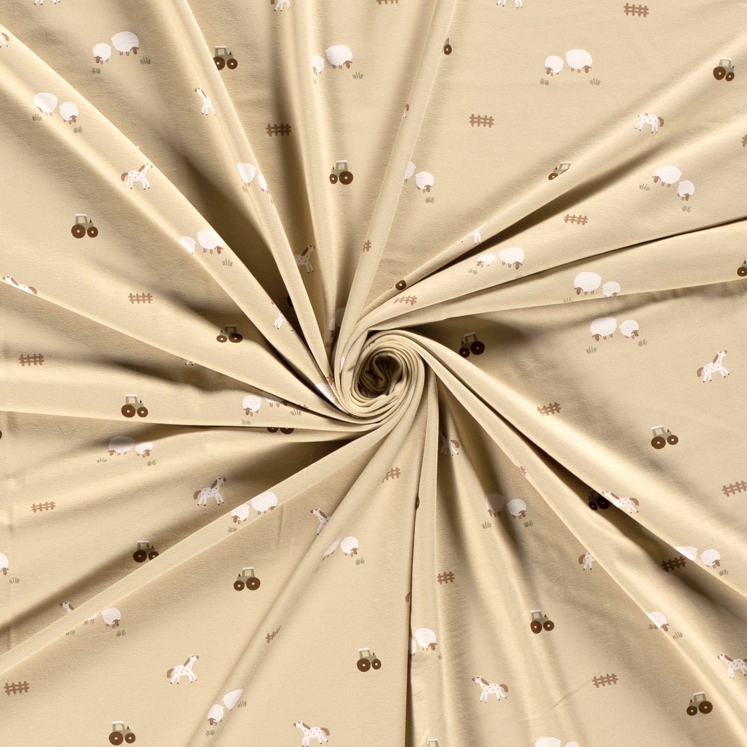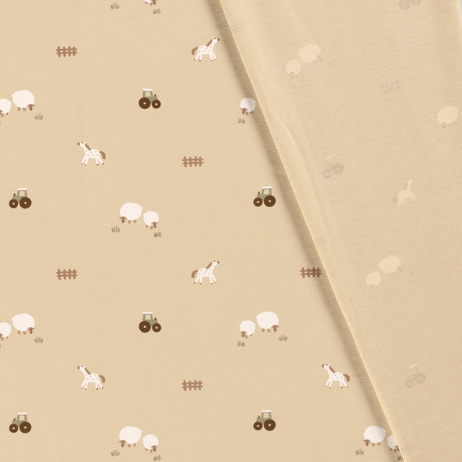 Produktinformationen "Baumwolljersey bedruckt, Bauernhof beige"