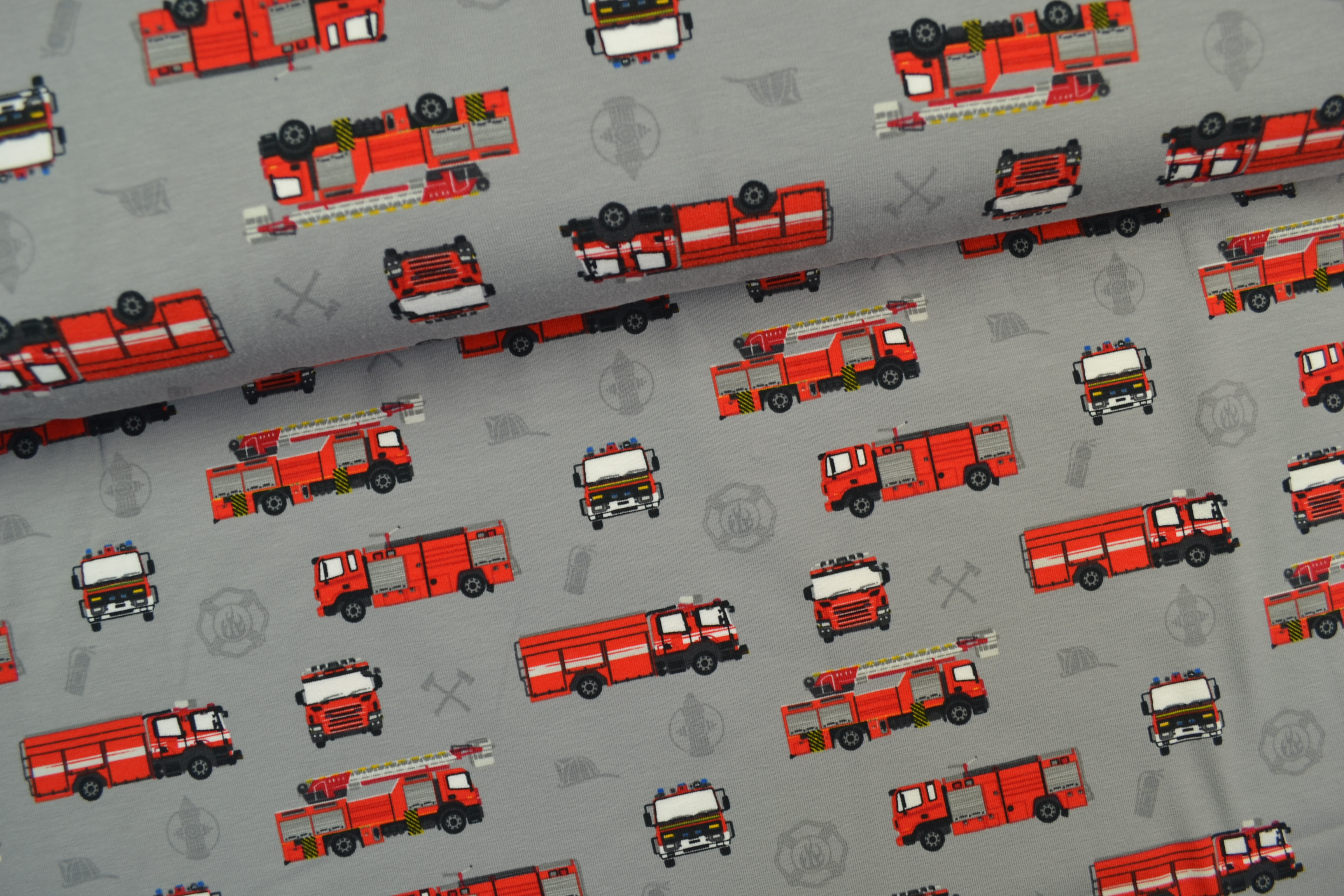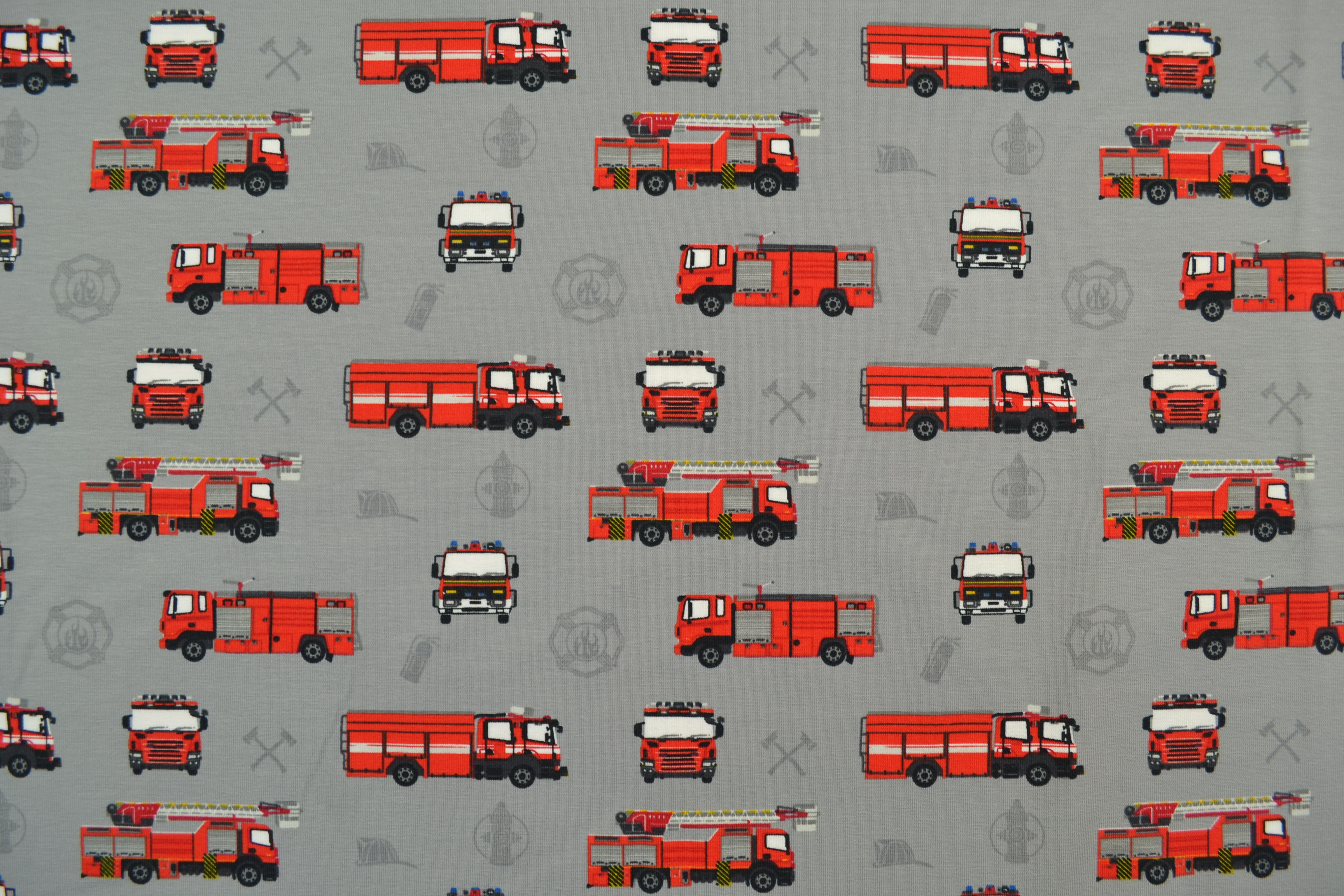 Baumwolljersey gemustert Feuerwehrfahrzeuge, grau