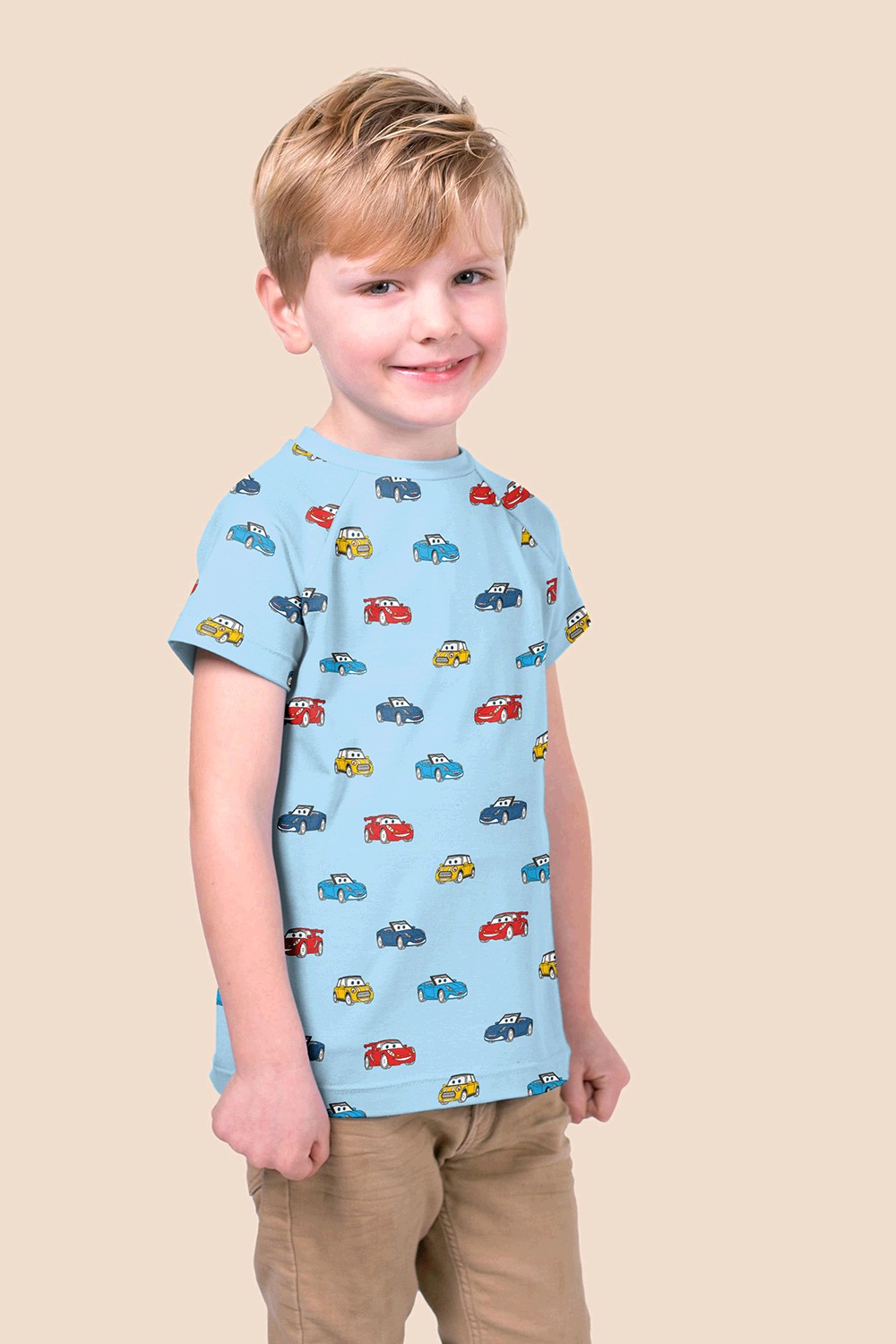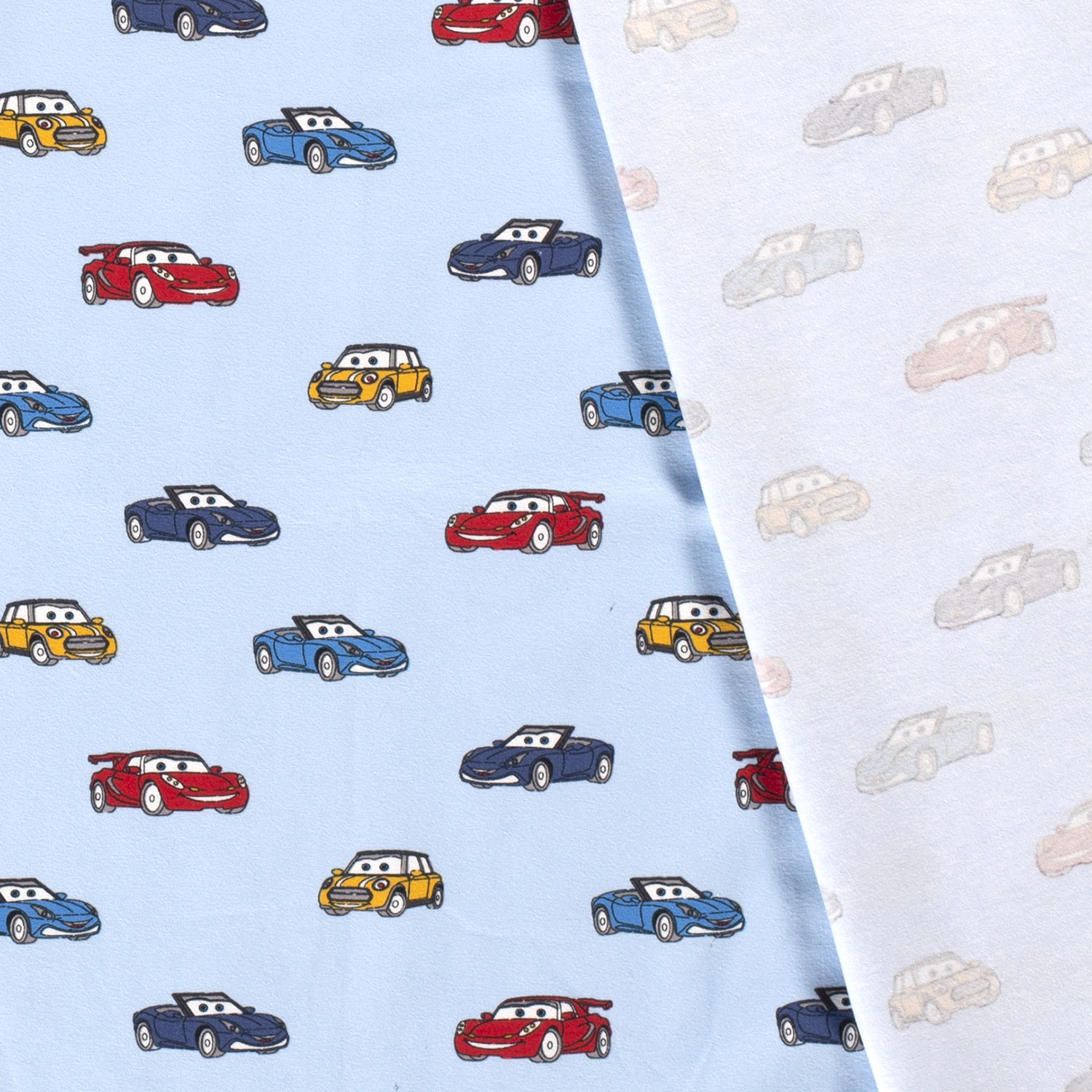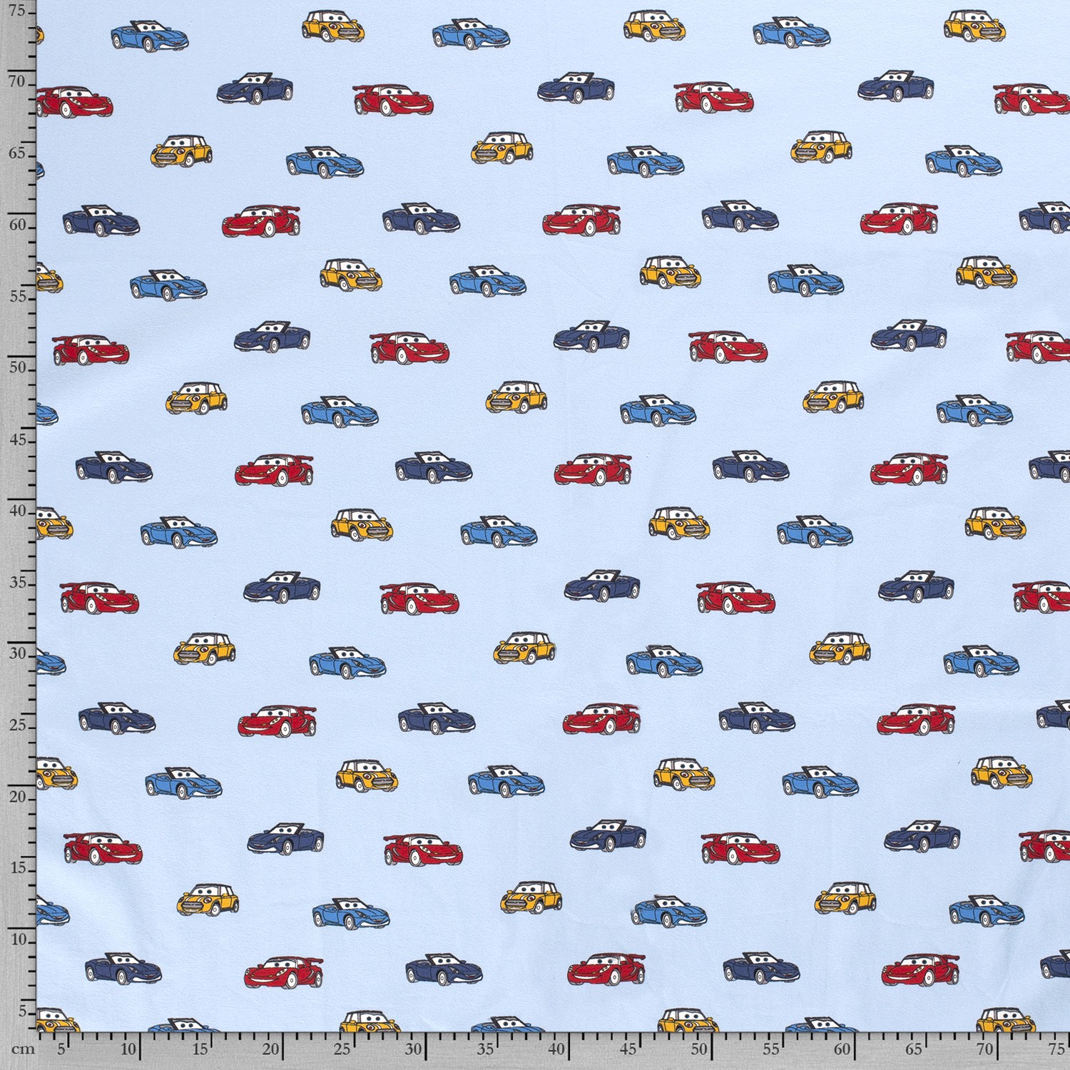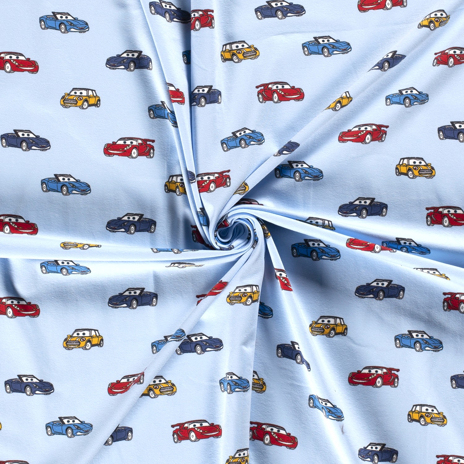 Produktinformationen "Baumwolljersey bedruckt Rennautos, hellblau"