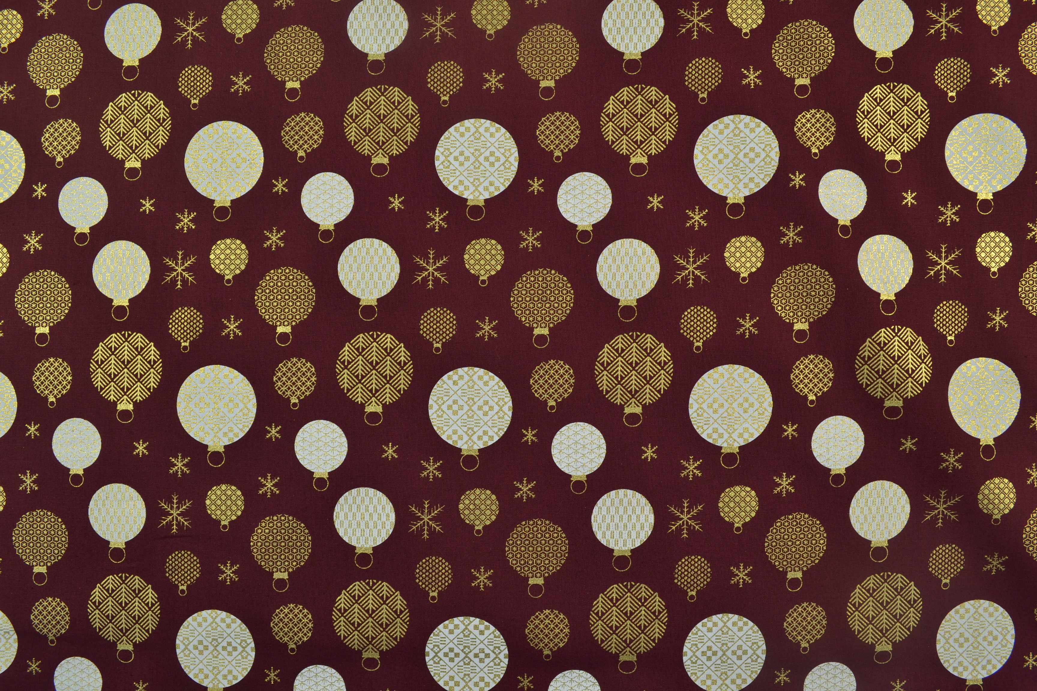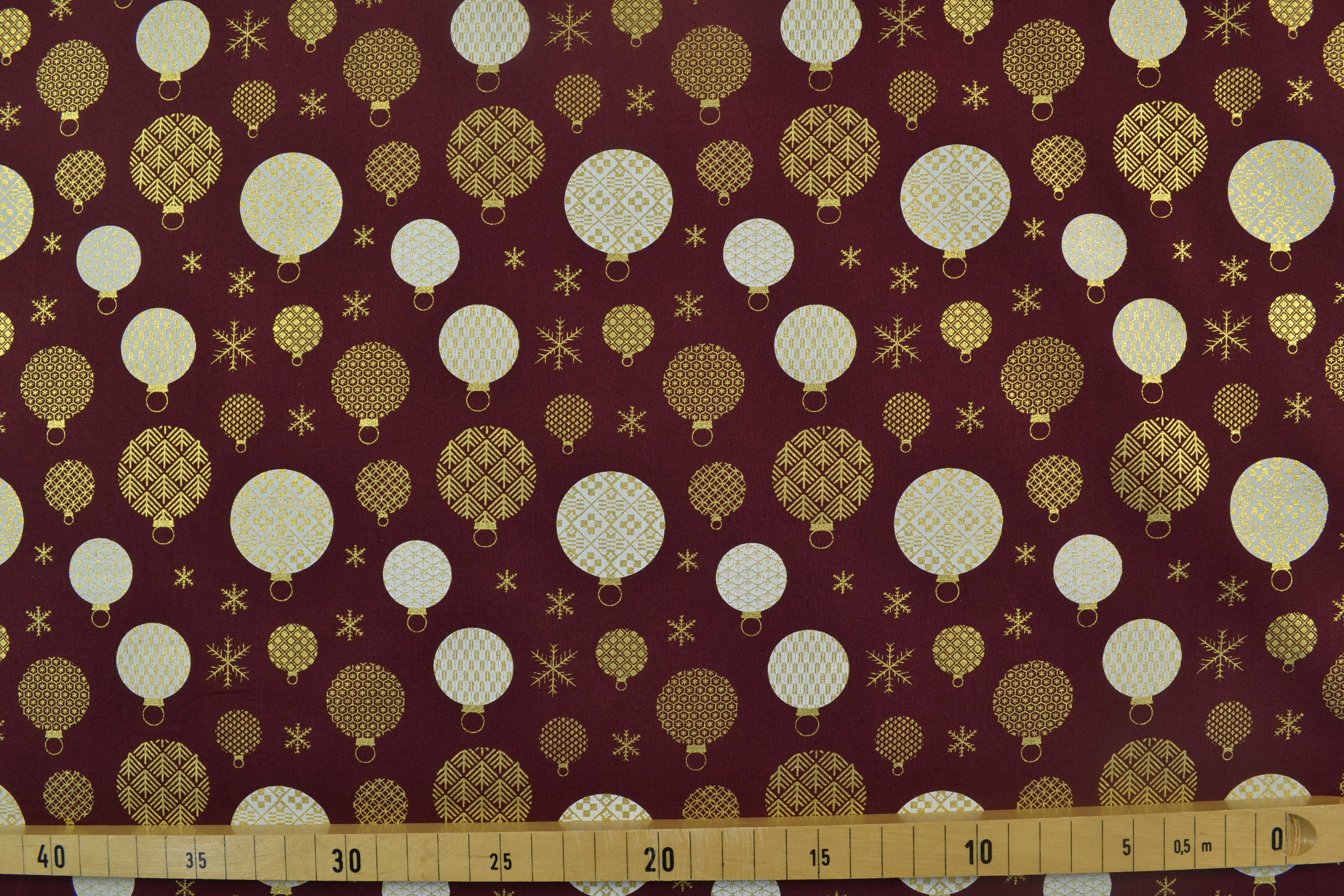 Produktinformationen "Baumwollstoff Weihnachten, Glitzerkugeln weinrot/gold"