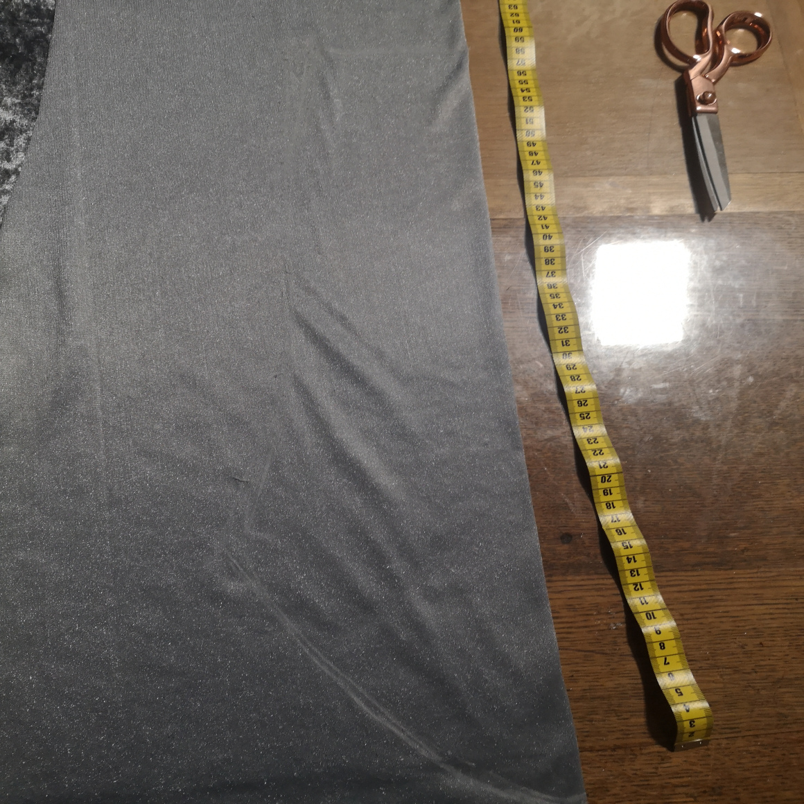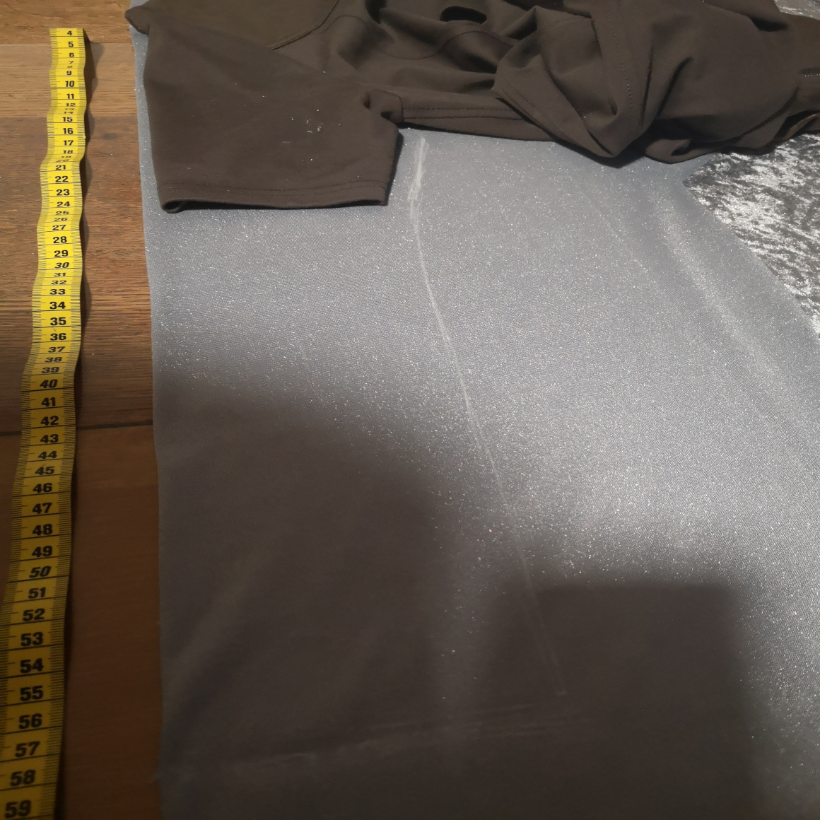 Mein Kleid hat kurze Arme, ich möchte aber lange Arme, also Messe ich meine Armlänge von der Schulter bis zum Handgelenk aus und verlängere meine Arme auf meinem Stoff.
