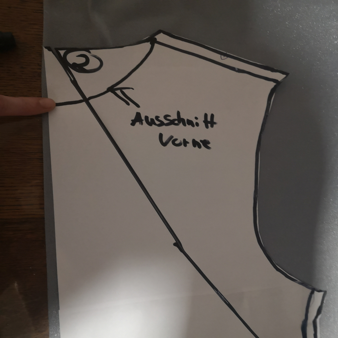 Nun nehme ich mir mein Papierschnittteil vom Rücken und füge die auseinandergezogene Linie wieder zu einem Stück aneinander. Ich vergrößerte mir den Halsausschnitt für mein Vorderteil etwas und schneide den Teil weg.