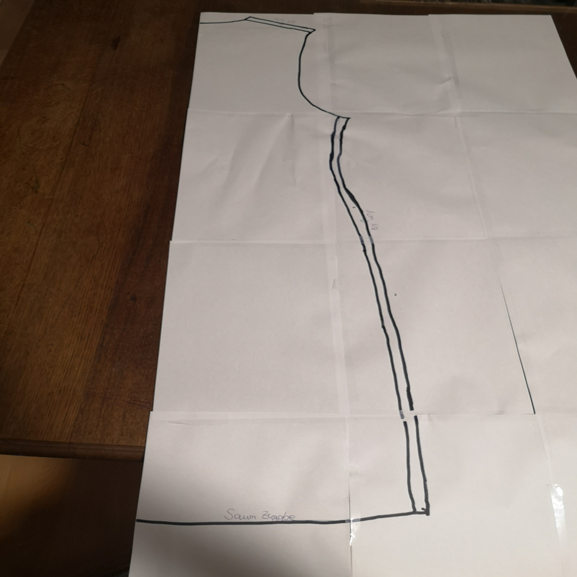 Ich klebe mir einige Seiten Papier zusammen, damit ich mir meinen Schnitt für das Rückenteil erstellen kann. Dann lege ich mein Kleid in den Bruch und lege es mit dem Rücken zu mir an der Kante des Papiers.