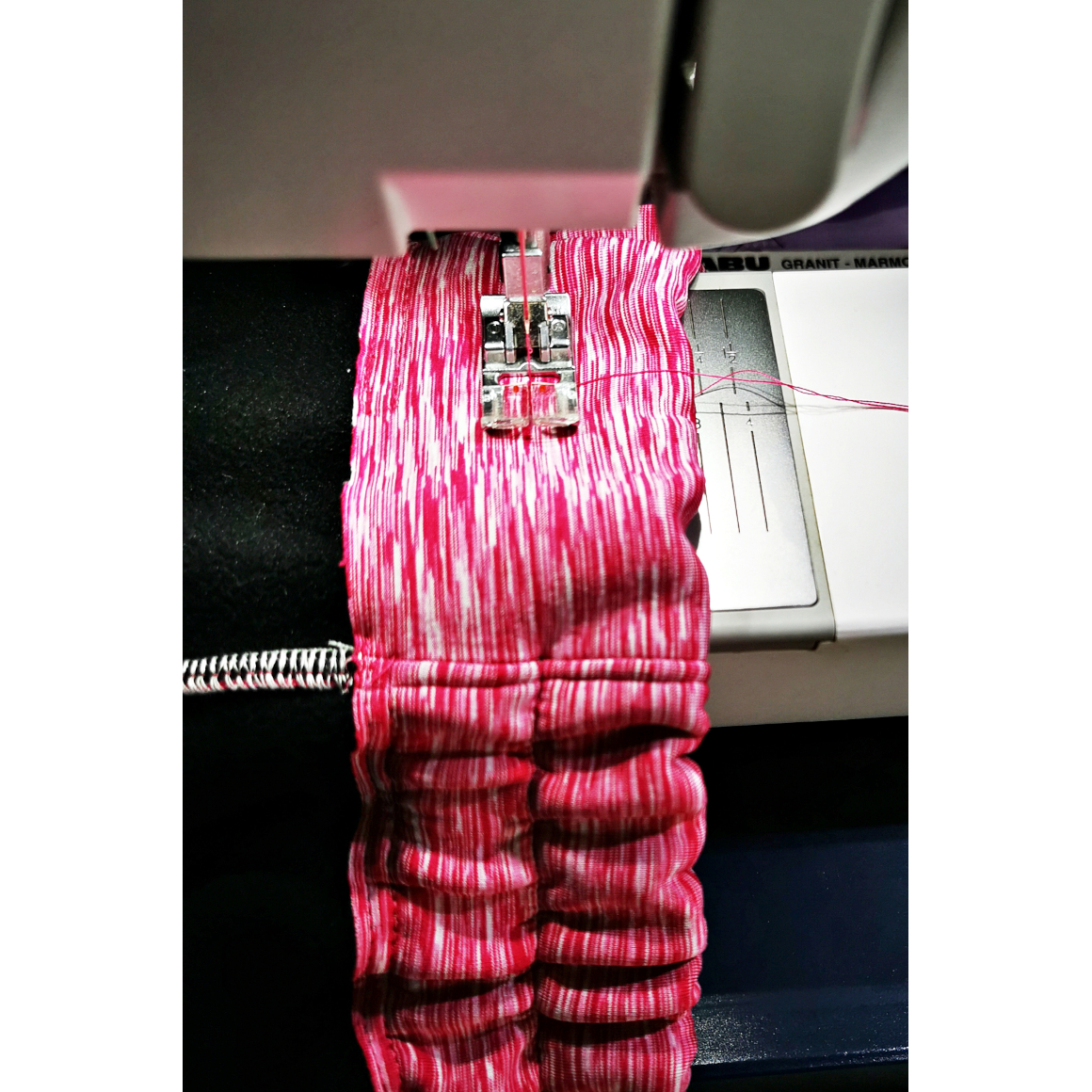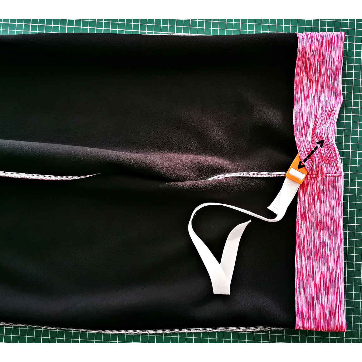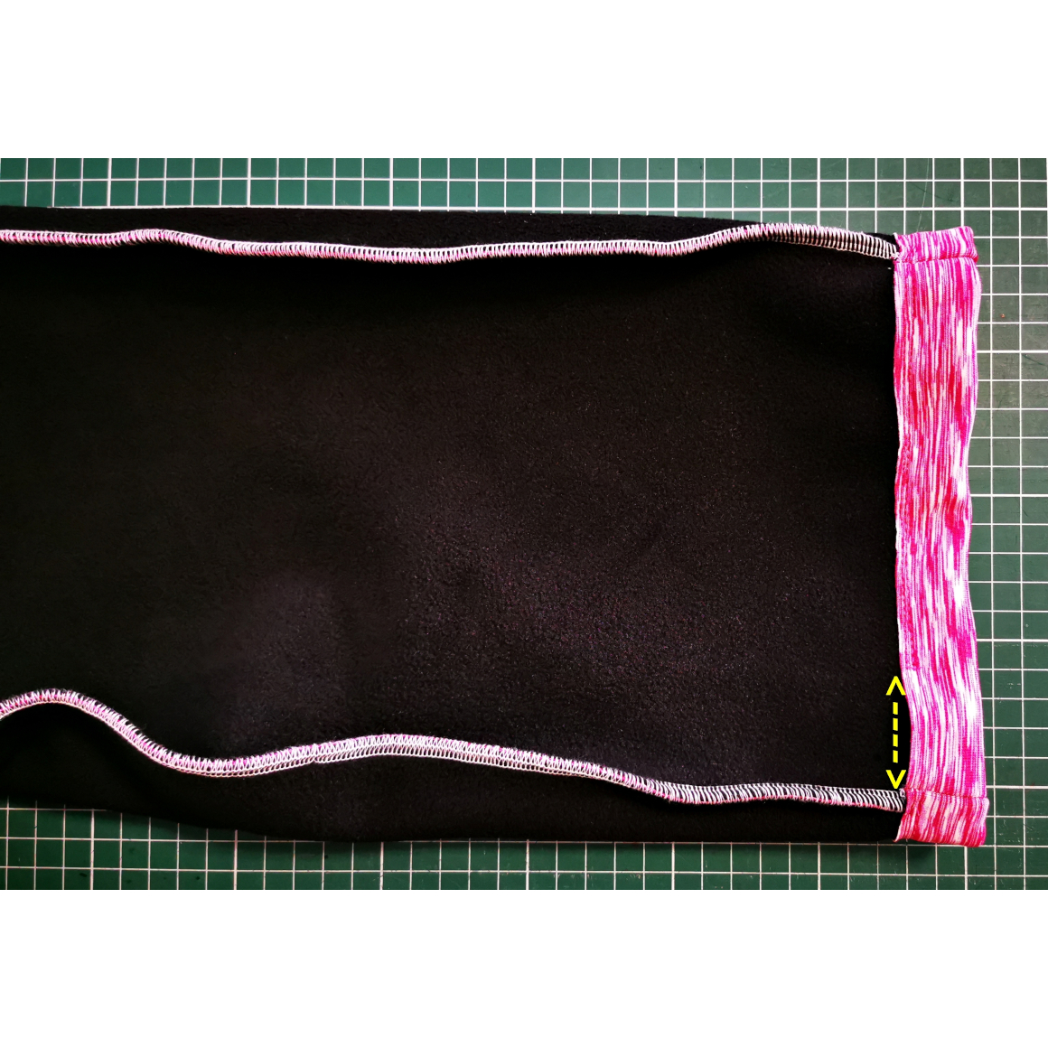 Nun steppst Du den oberen Saum ab. Achte auch hier darauf, dass Du eine Öffnung für das Gummiband lässt. Optional habe ich in der Bundmitte noch einmal abgesteppt, so kann ich zwei schmalere Gummibänder durchziehen.