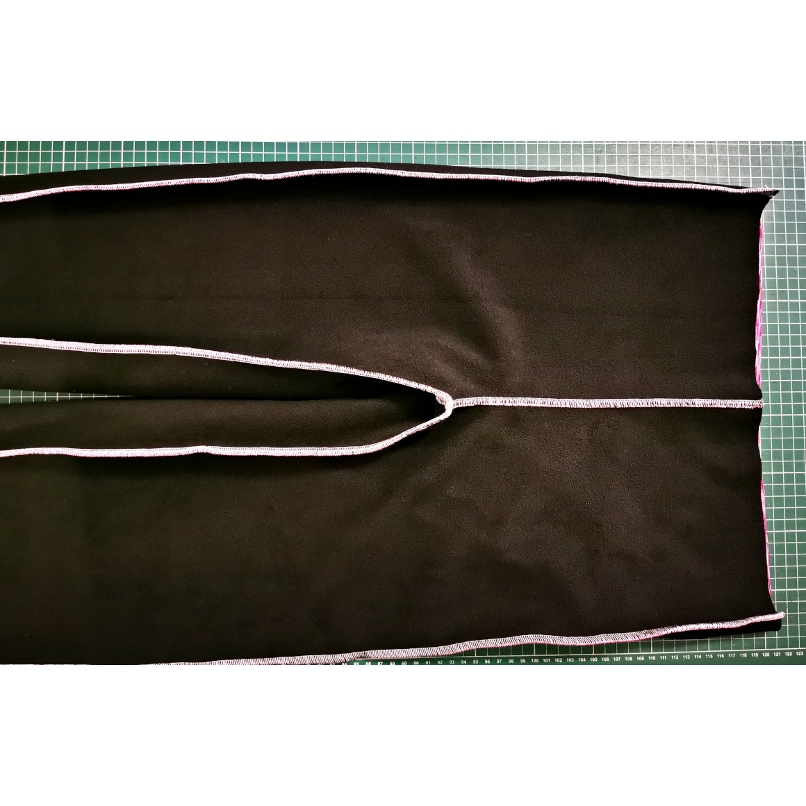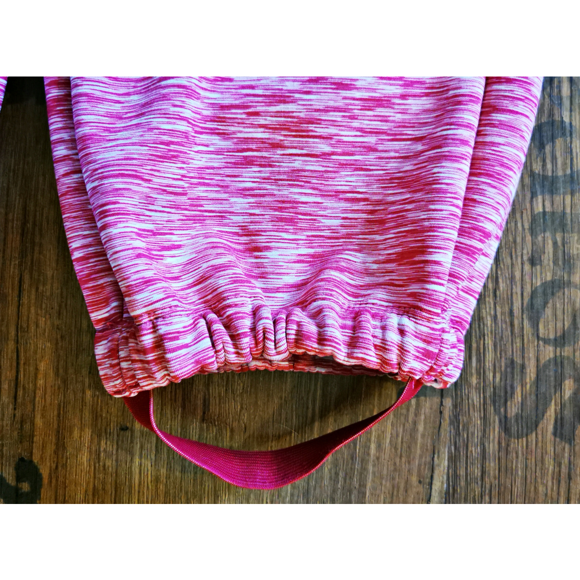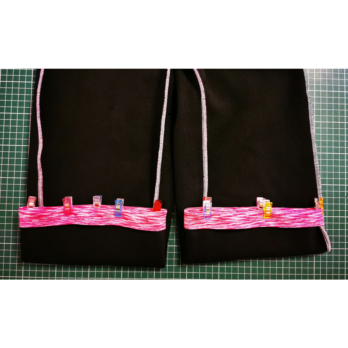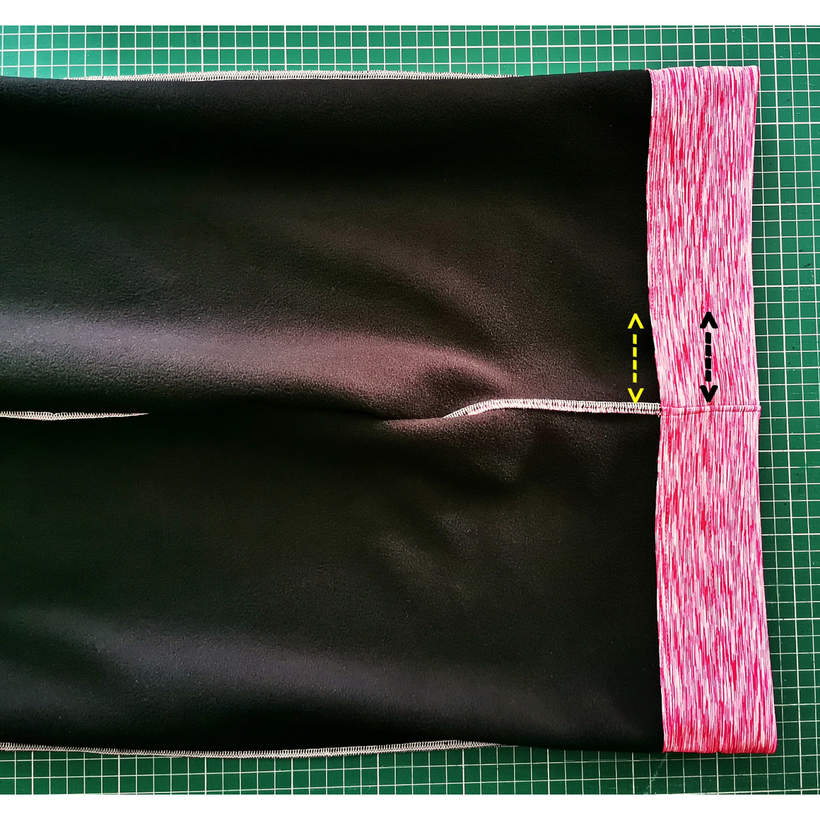 Nun steppst Du den oberen Saum ab. Achte auch hier darauf, dass Du eine Öffnung für das Gummiband lässt. Optional habe ich in der Bundmitte noch einmal abgesteppt, so kann ich zwei schmalere Gummibänder durchziehen.