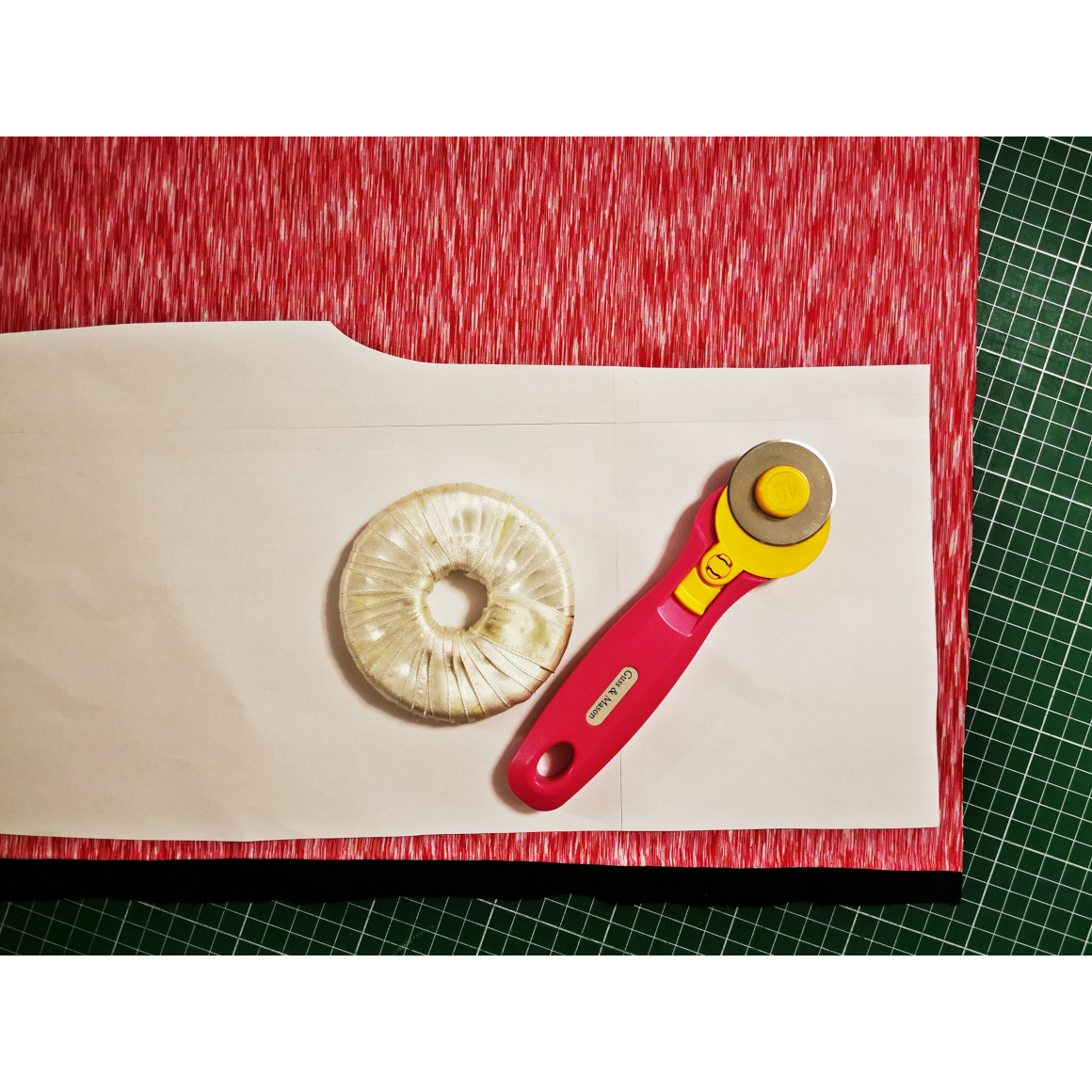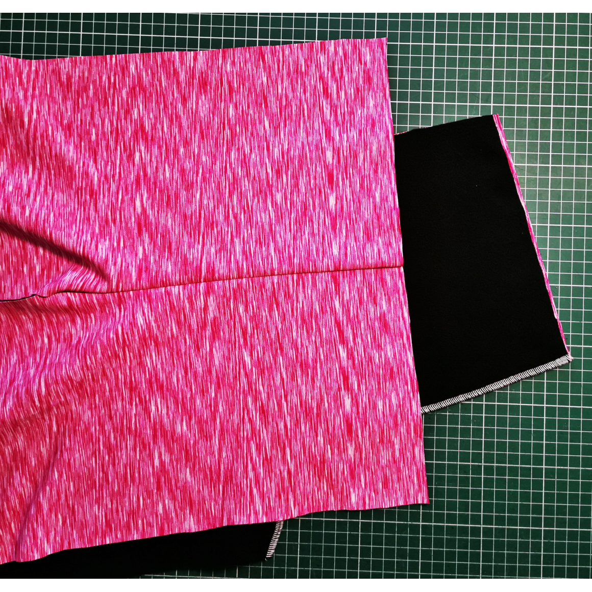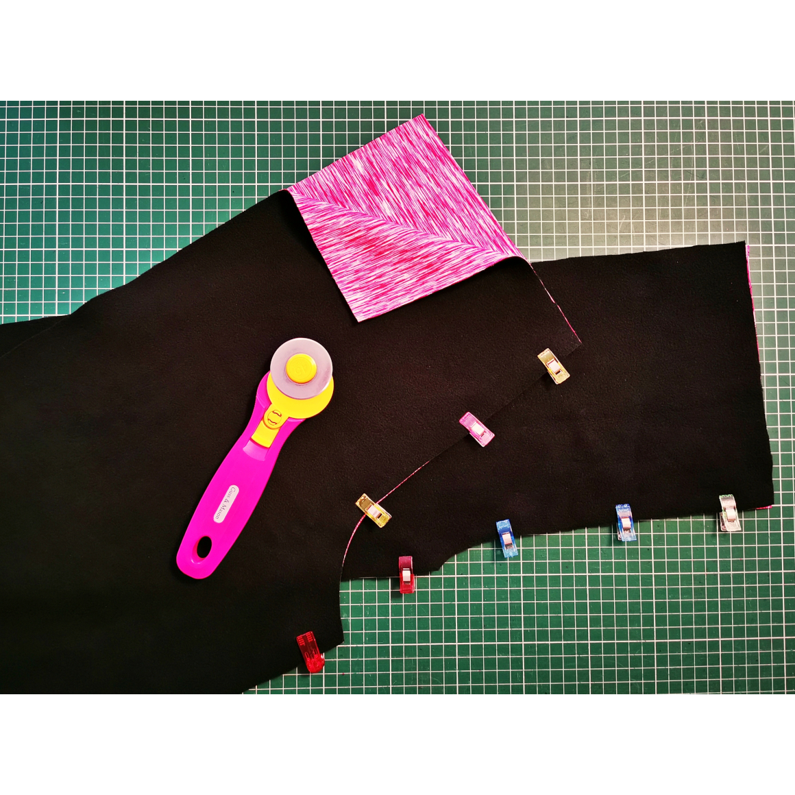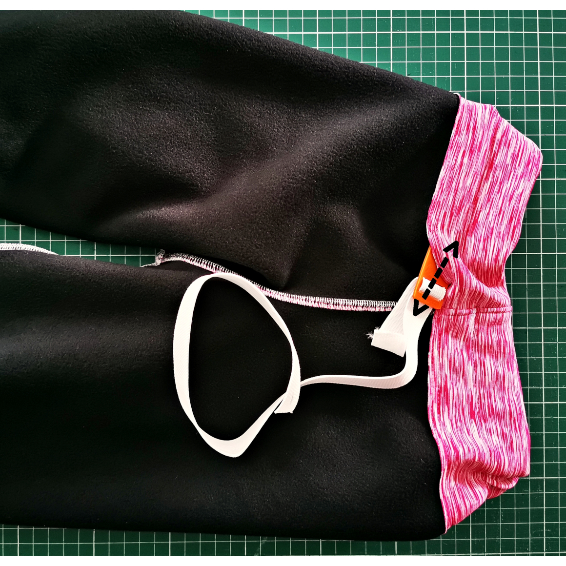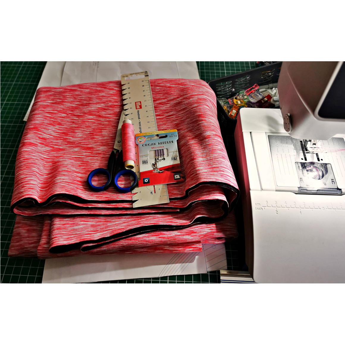 Du benötigst einen Softshell-Stoff. Ebenso Gummiband, MIcrotexnadeln und einen Rollschneider oder Schere. Lege Dir Dein Material zurecht