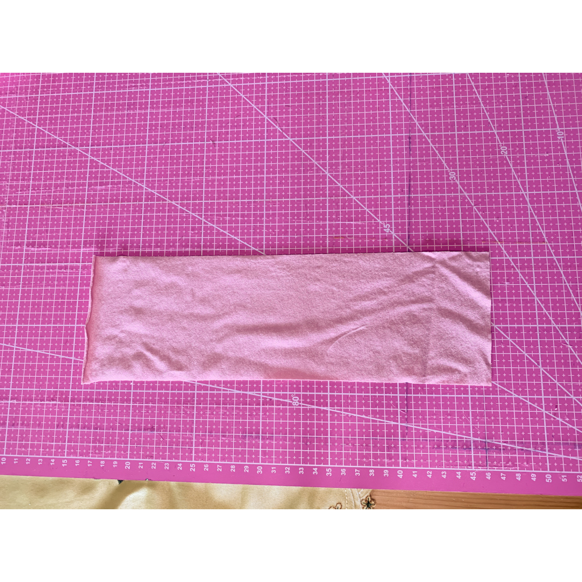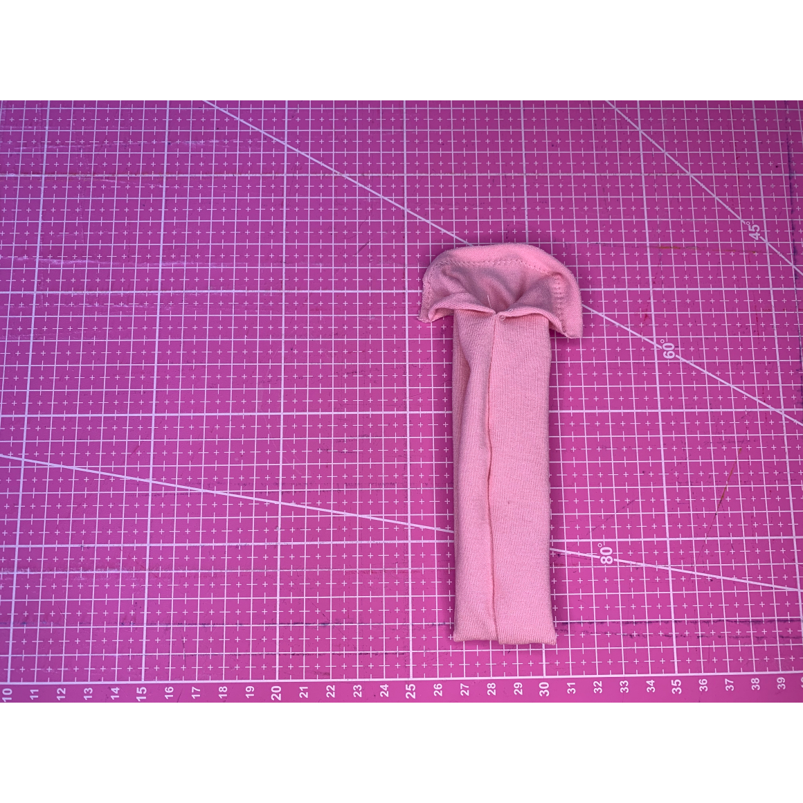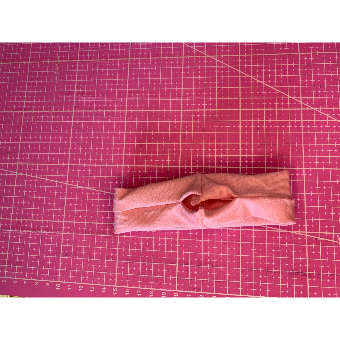 Als nächstes faltet Ihr den Schlauch einmal auf die Hälfte der Länge. Achtet dabei darauf, dass zum einen die Naht in der Mitte liegt und Ihr die Naht nach dem falten sehen könnt.