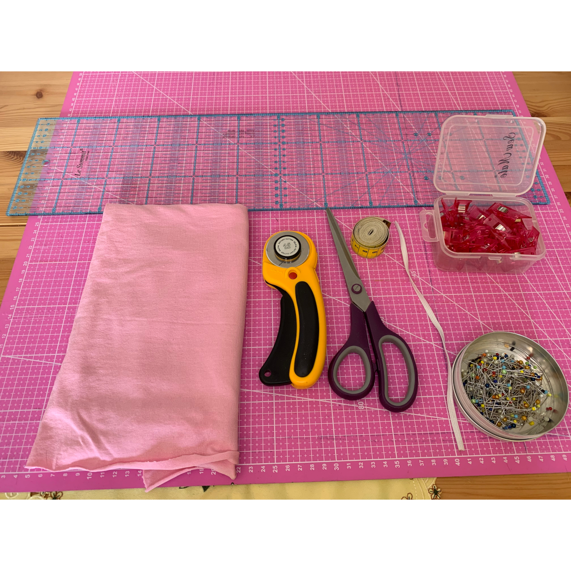 Zusätzlich benötigst Du: Nähgarn, Schere, Maßband, Stoffklammern/Stecknadeln, Gummizugband 0,5cm - 1,5 cm Stärke, eine Sicherheitsnadel und ggf. eine Schneidmatte.