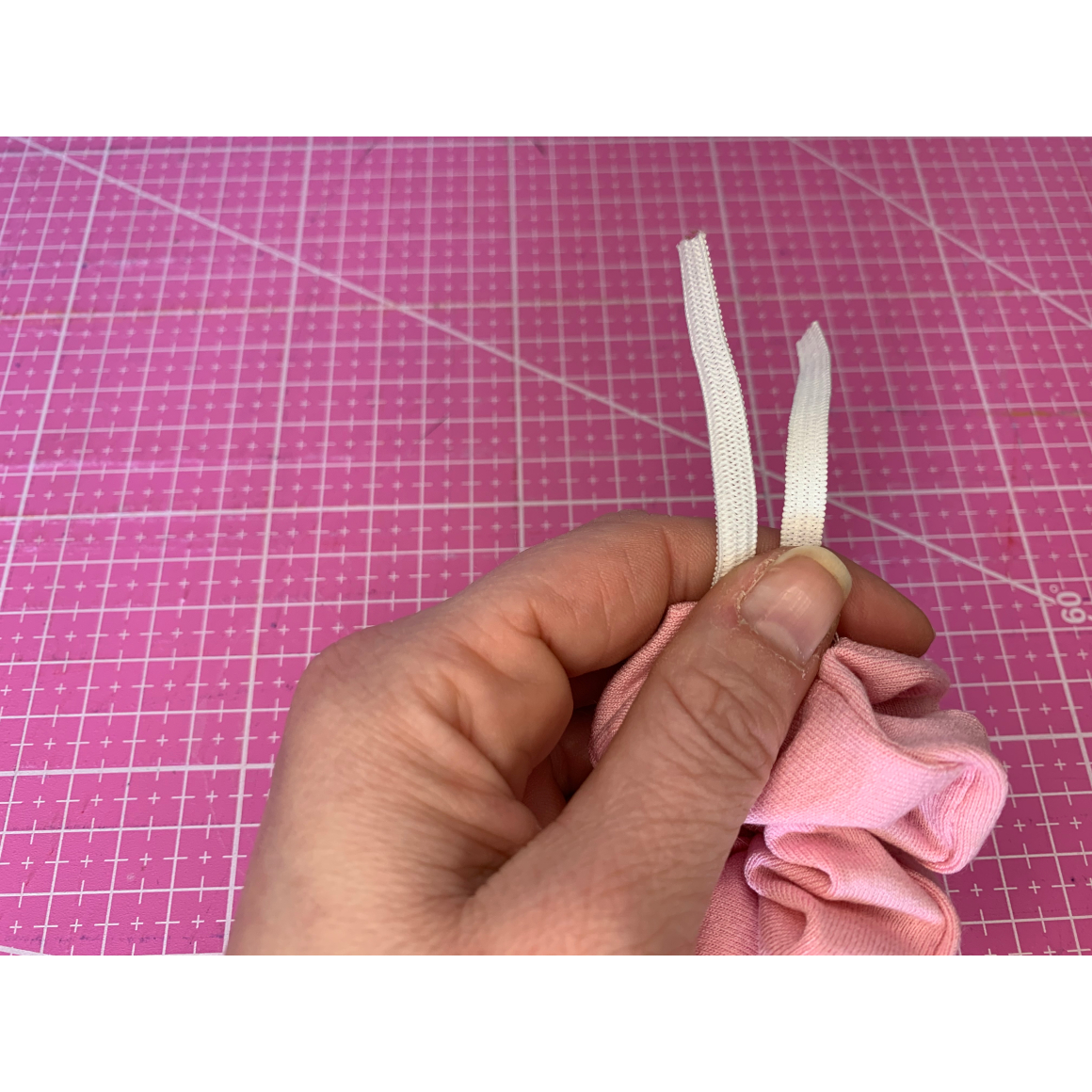Zuletzt müsst Ihr nur noch das Gummizugband in den Scrunchie stecken und die Wendeöffnung verschließen. Hierzu könnt Ihr entweder einen Matratzen- oder Leiterstich verwenden oder Ihr näht es knappkantig zu.