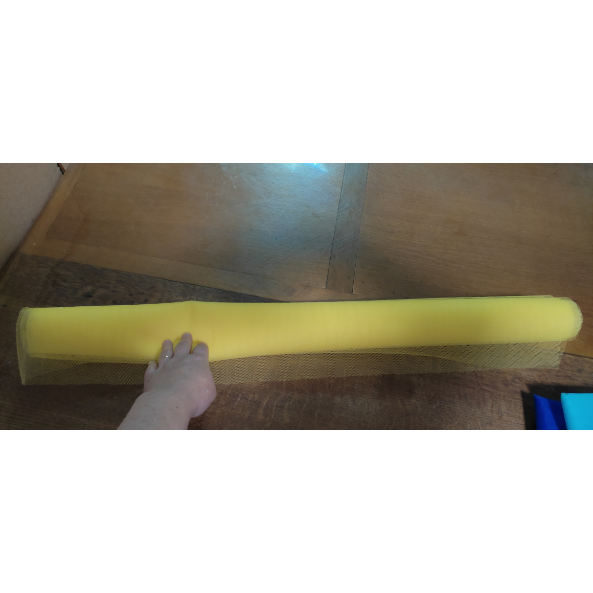 Lege die Tüllbbahnen pro Farbe übereinander und rolle Diese zu einer dicken Tüllrolle zusammen.