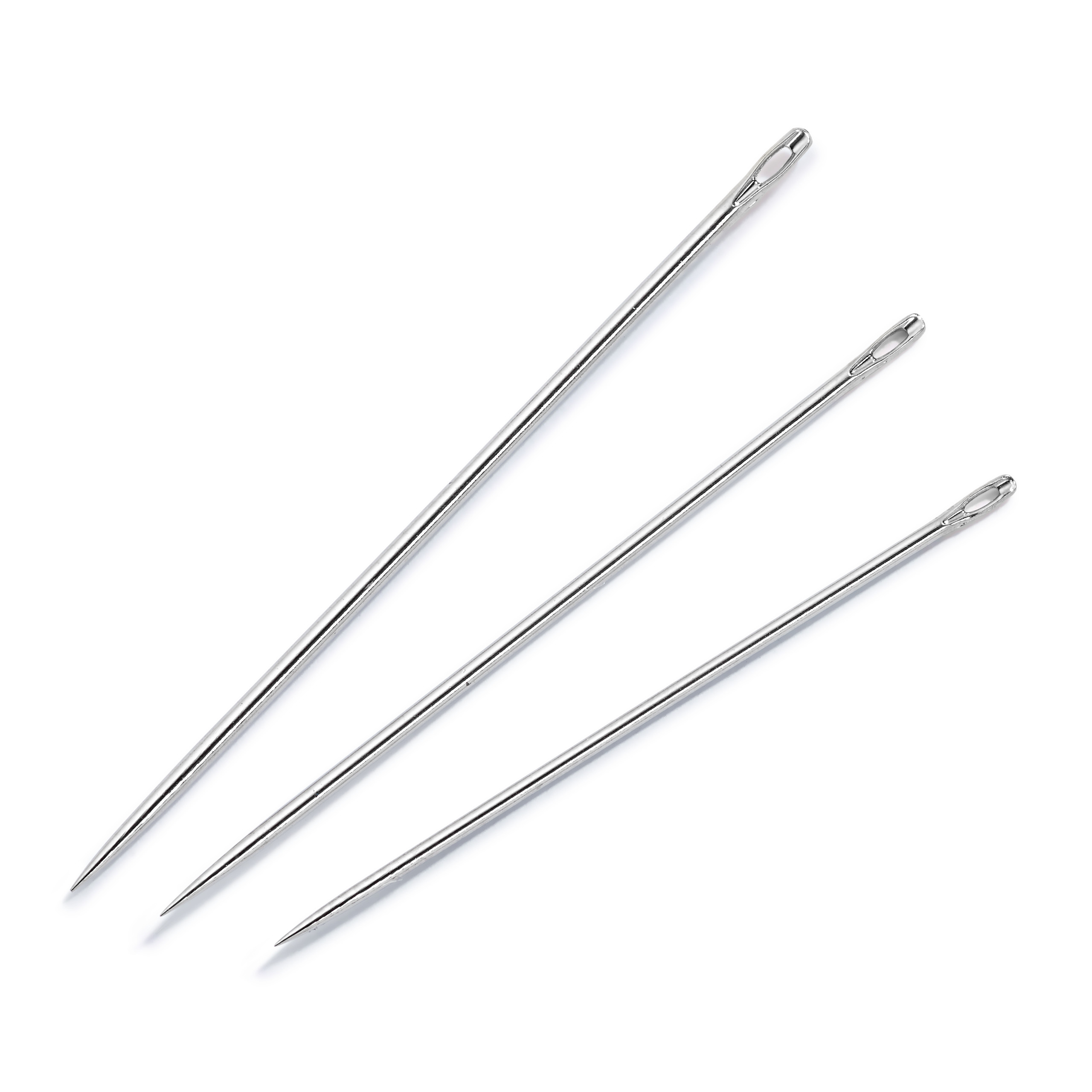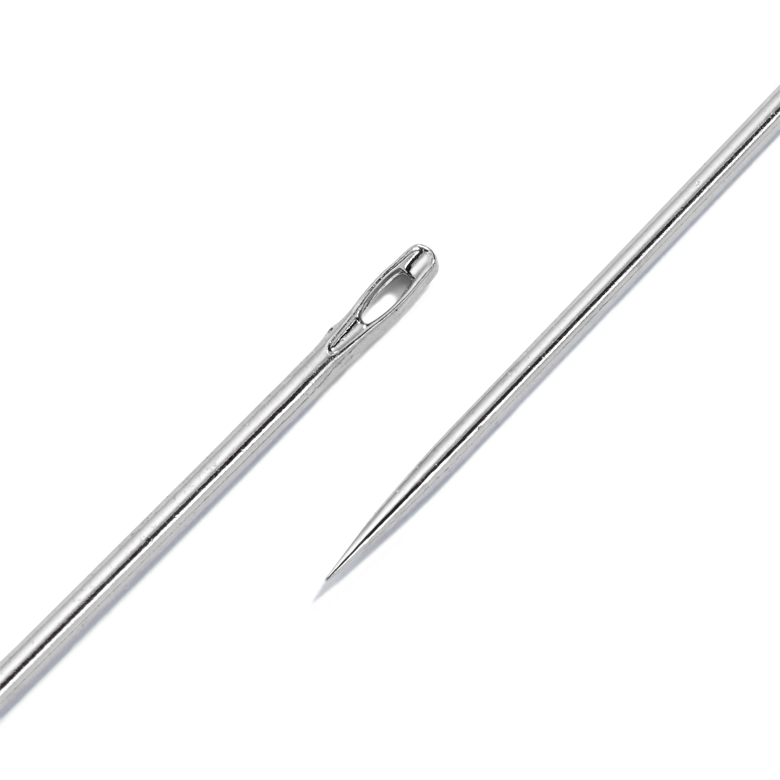 Die langen und halblangen Nähnadeln sind aus gehärtetem Stahl gefertigt und haben ein gratfrei gestanztes Öhr. Ihre fein und schlank ausgeschliffene Spitzenform sowie die glatte, porenfrei beschichtete Oberfläche lassen sie gut durch alle Stoffe gleiten. Die abgestimmte Federhärte sorgt für ein geschmeidiges Arbeiten ohne Verbiegen und Bruch – selbst bei feinsten Nadeln. Der Nadelkopf ist so geformt, dass sich die Nadeln auch ohne Fingerhut problemlos führen lassen. In der Regel sind die langen Nähnadeln ca. 7 mm länger als die entsprechend halblangen Nadeln und werden für alle gängigen Näharbeiten verwendet.