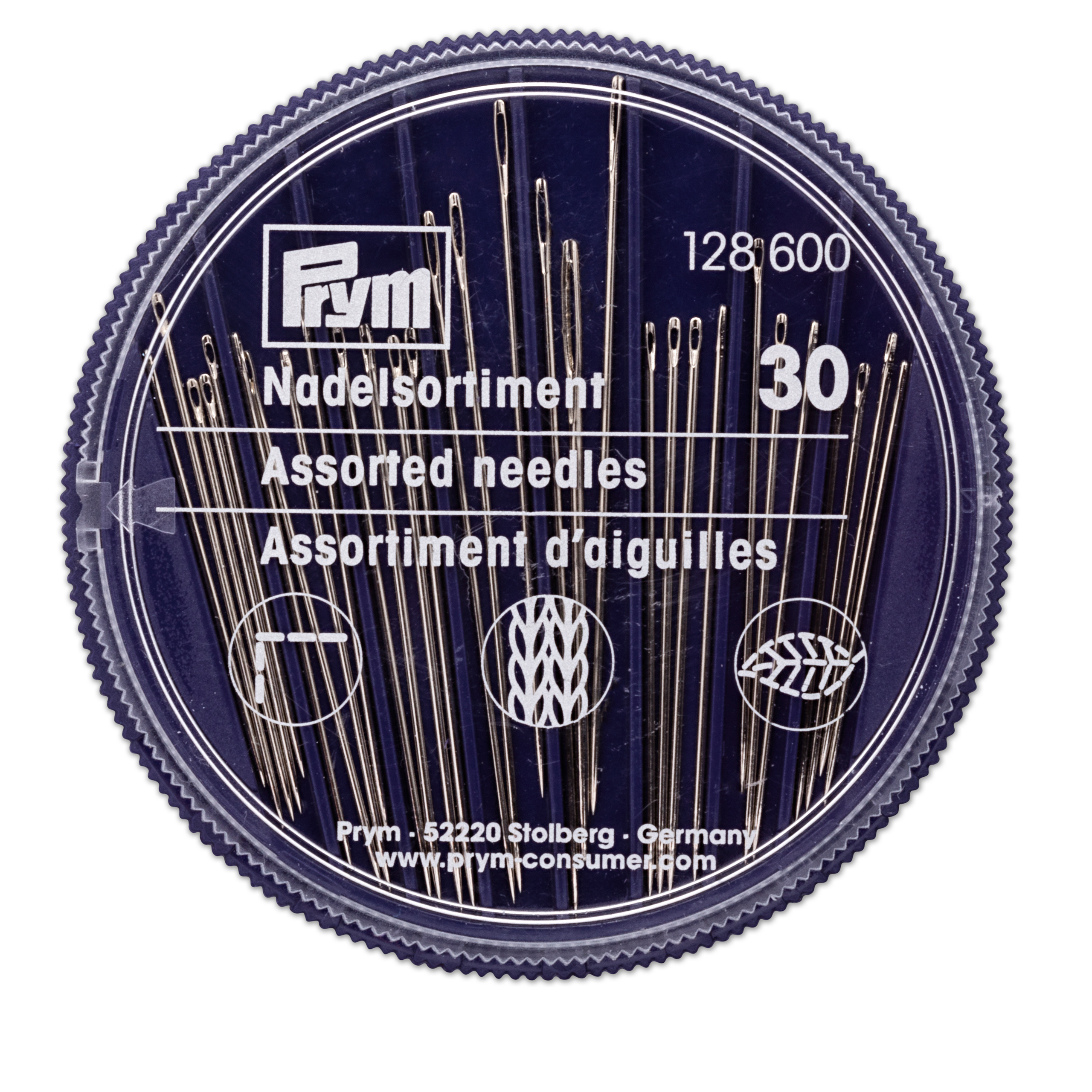 Das runde Dosenunterteil aus pflaumenblauem Kunststoff mit transparentem, bedrucktem Deckel enthält 24 oder 30 Näh-, Stick- und Stopfnadeln in unterschiedlichen Größen mit Silberöhr. Das Sortiment mit 24 Nadeln bietet zusätzlich die feinen Perlnadeln aus Federstahl. Alle Anforderungen an kleinere Näh-, Stick- und Stopfarbeiten, aber auch Bastel- und Applizierarbeiten, werden durch dieses Set abgedeckt. Durch eine seitliche Öffnung im drehbaren Deckel können die benötigten Nadeln aus dem jeweiligen Fach der Dose entnommen werden. Danach können sie wieder in die Dose zurückgeführt werden und sind dort sicher aufgehoben.