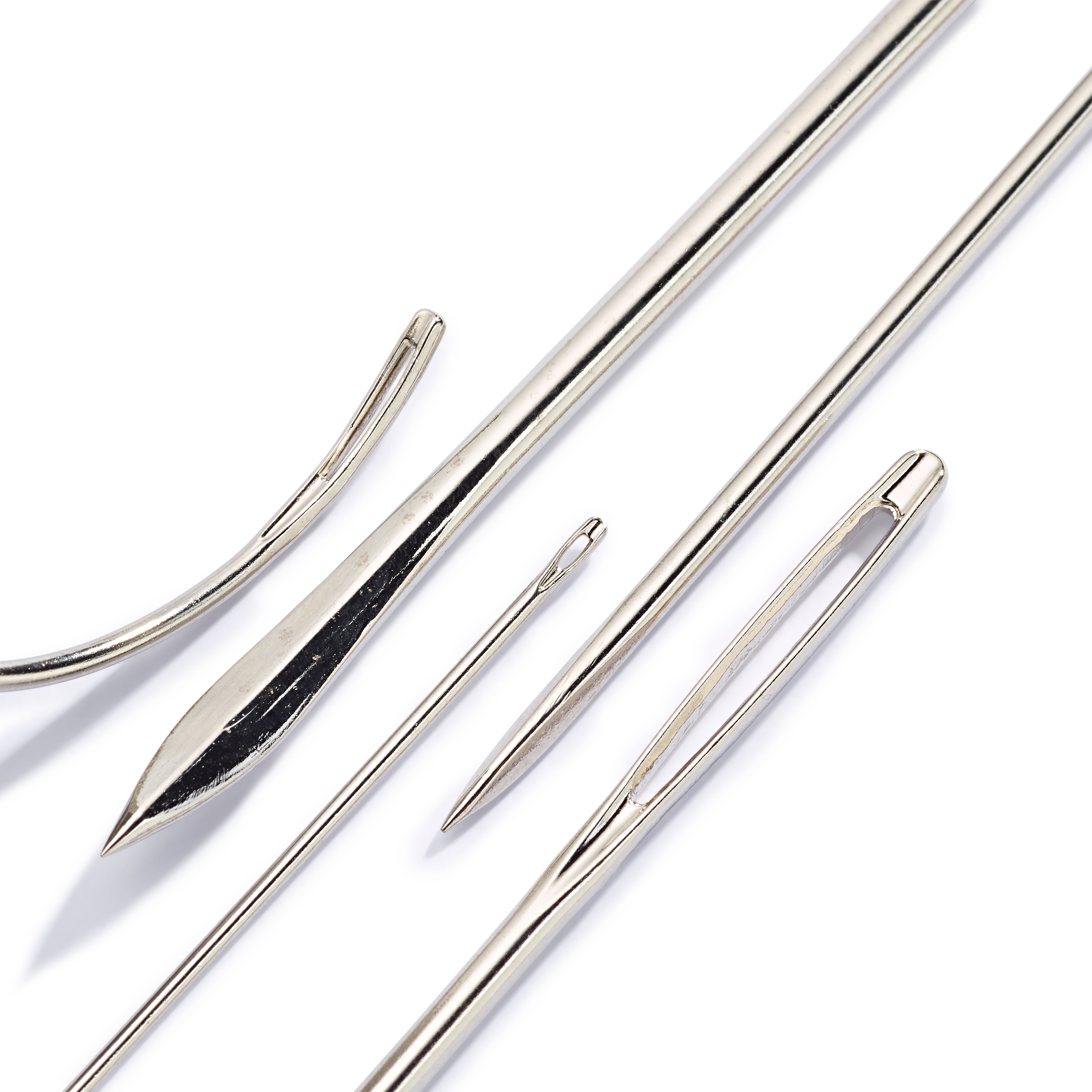 Dieses Sortiment aus fünf stabilen Handwerker-Nadeln hält für die Verarbeitung grober Stoffe und fester Materialien die geeigneten Nähwerkzeuge bereit. Das Set enthält je eine Sacknadel, eine Teppichnadel, eine Segel- und Zeltnadel, eine Ledernadel und eine gebogene Polsterernadel.