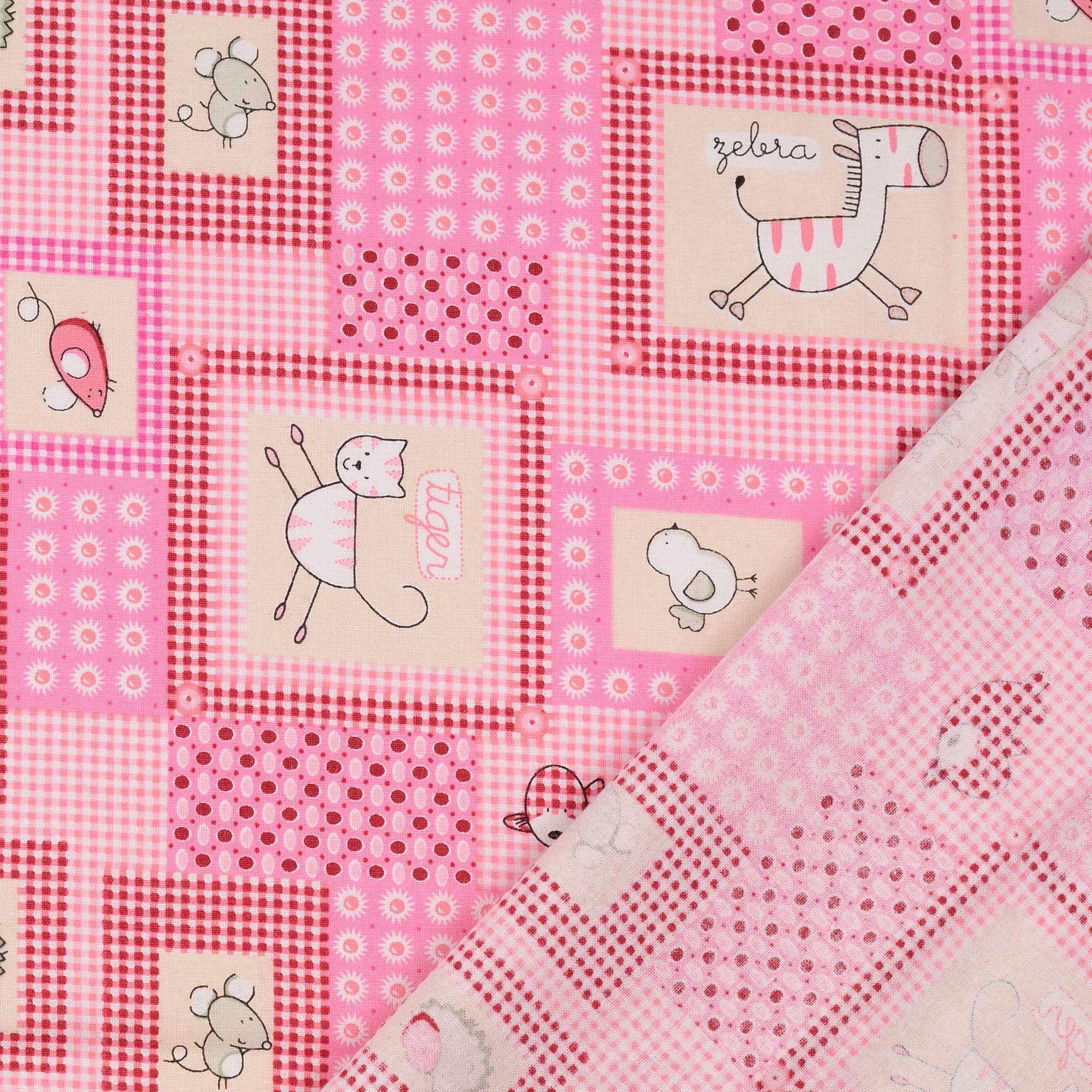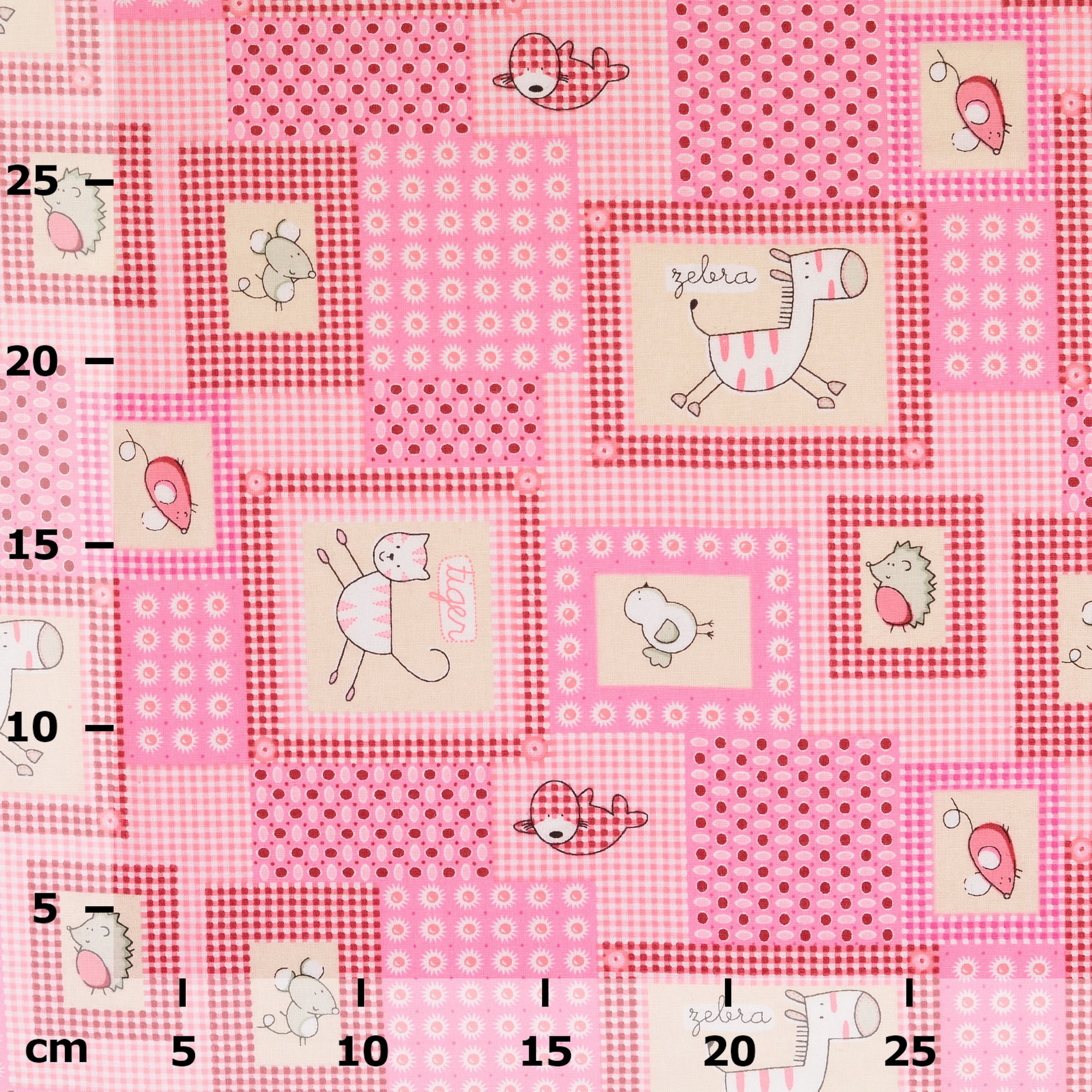 Produktinformationen "Baumwollstoff kariert, Tierwelt, pink/ beige "