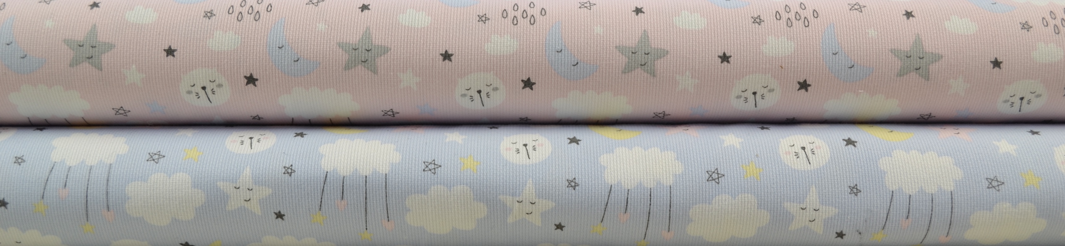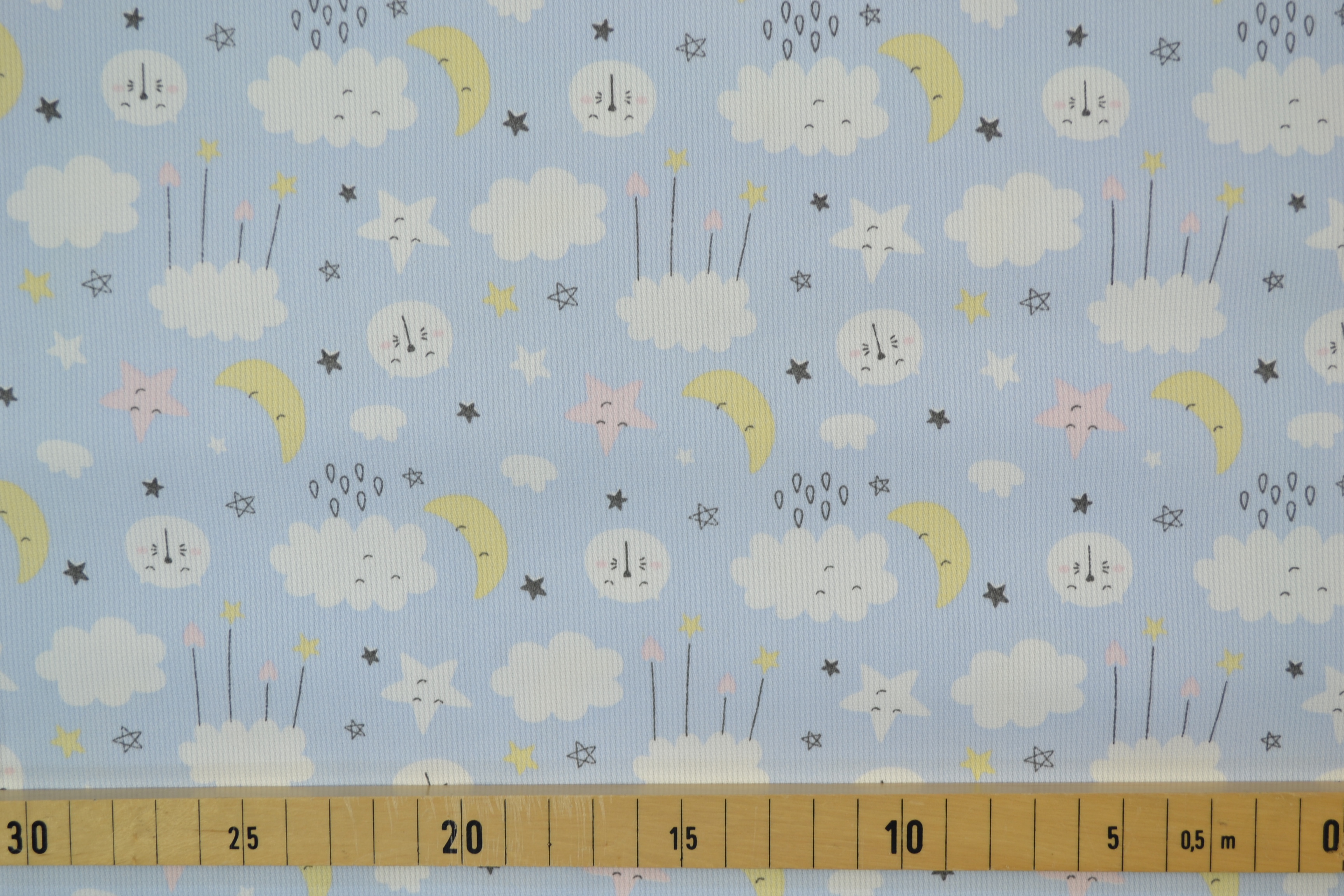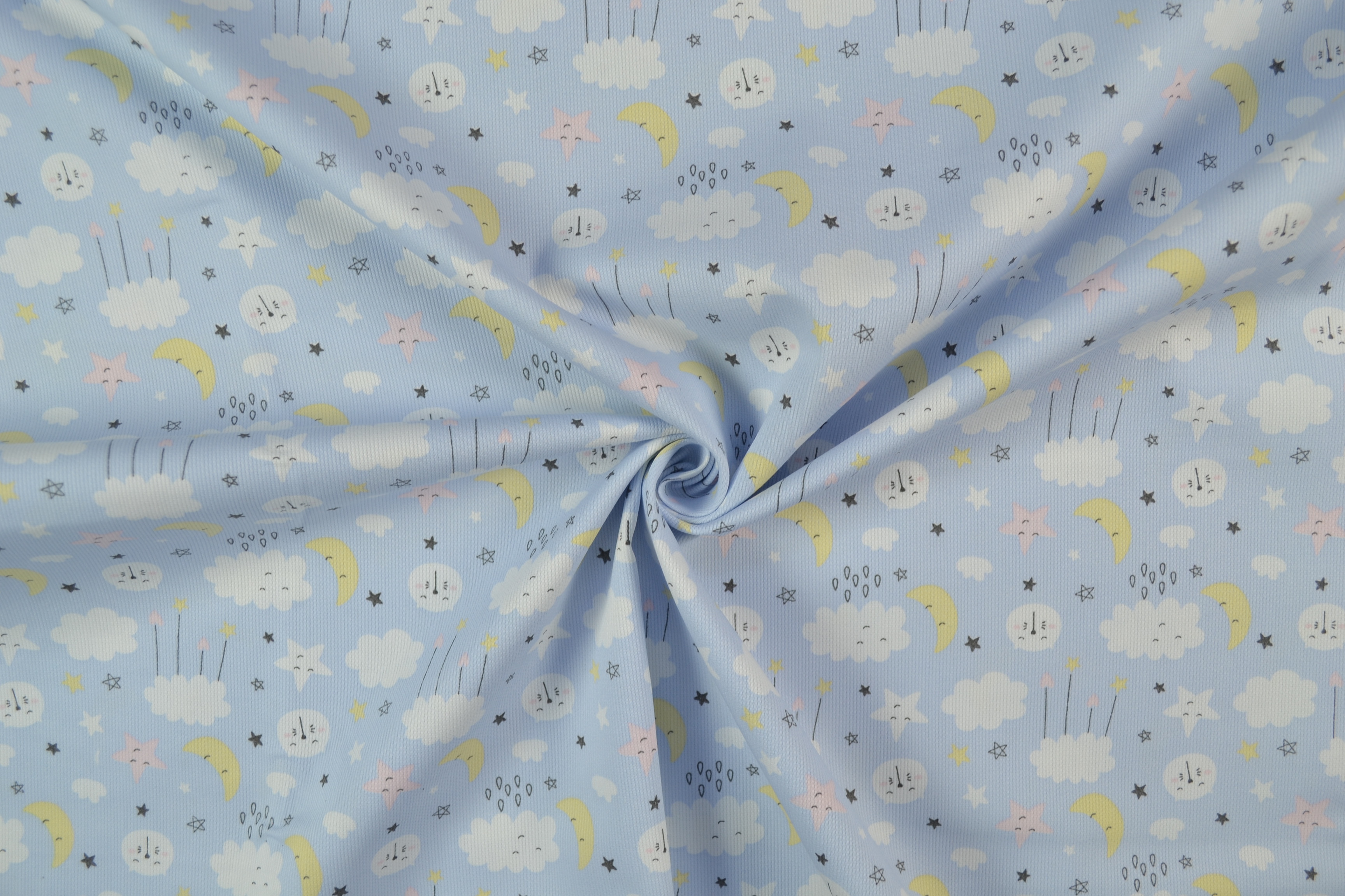 Baumwollstoff mit buntem Motiv, Nachthimmel hellblau: