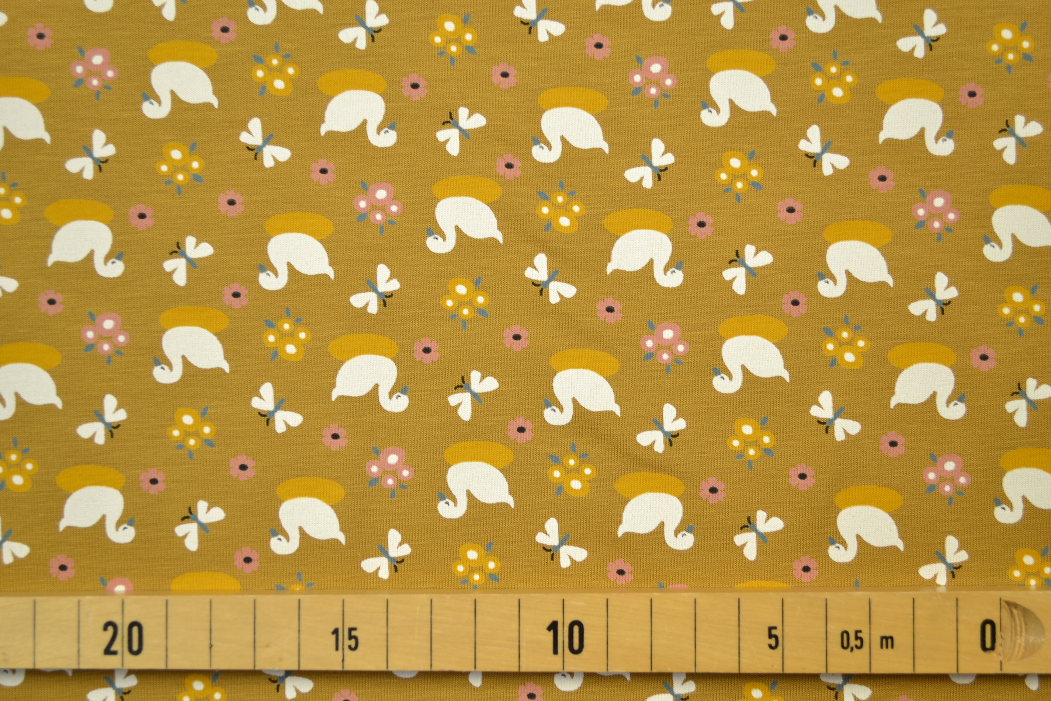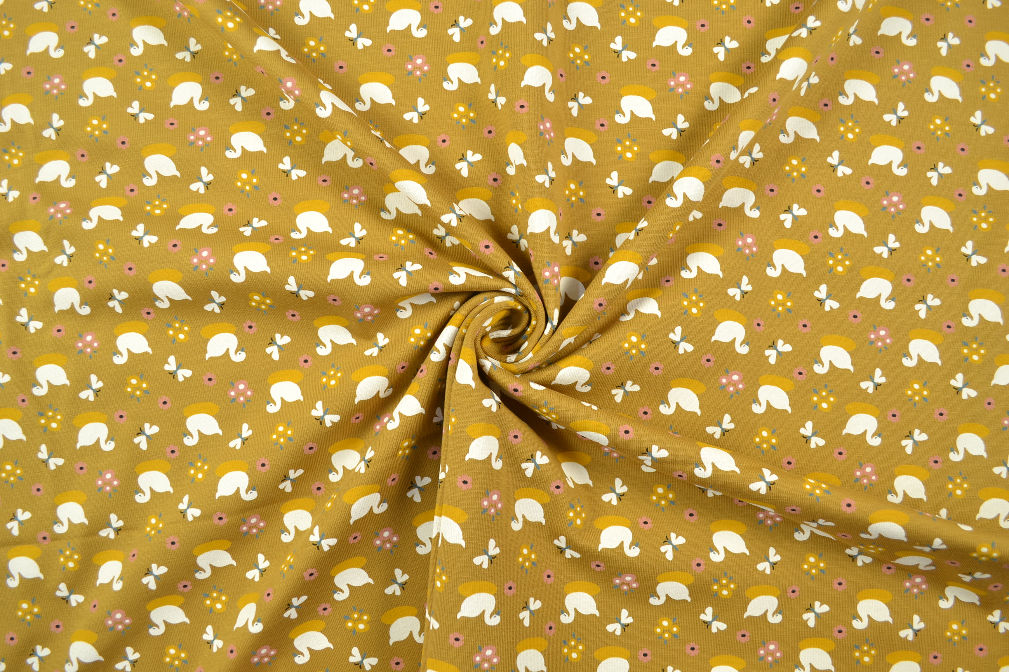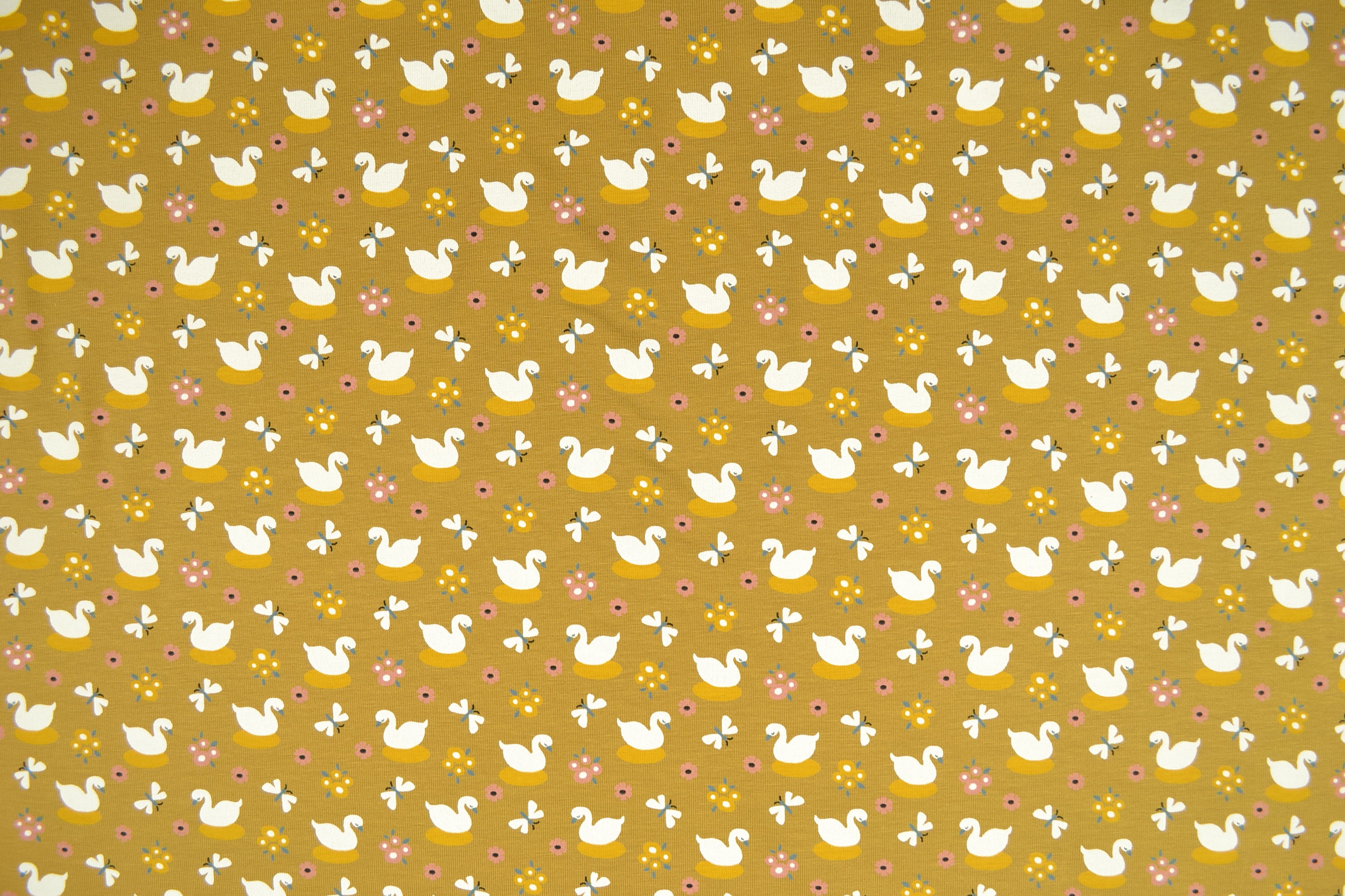 Baumwolljersey Bio-Organic Schwäne, senfgelb
