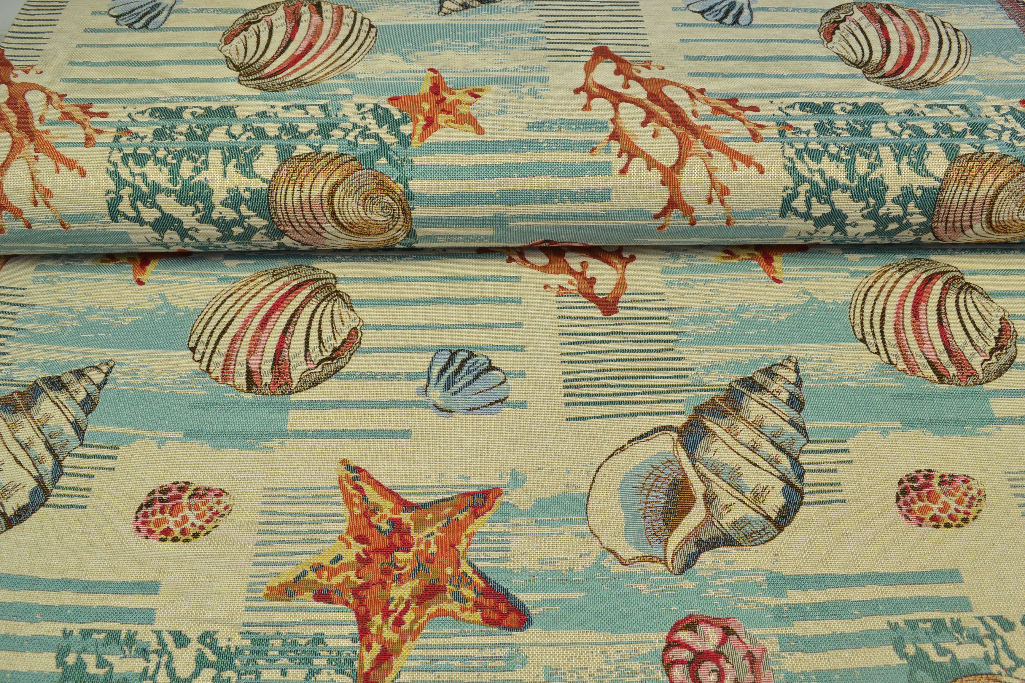 Gobelin Möbelstoff Muscheln, beige/blau