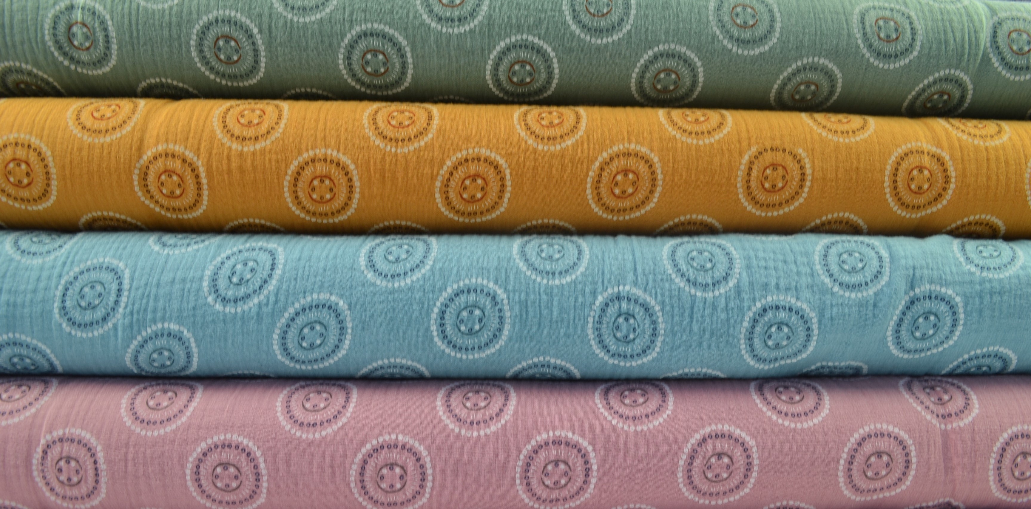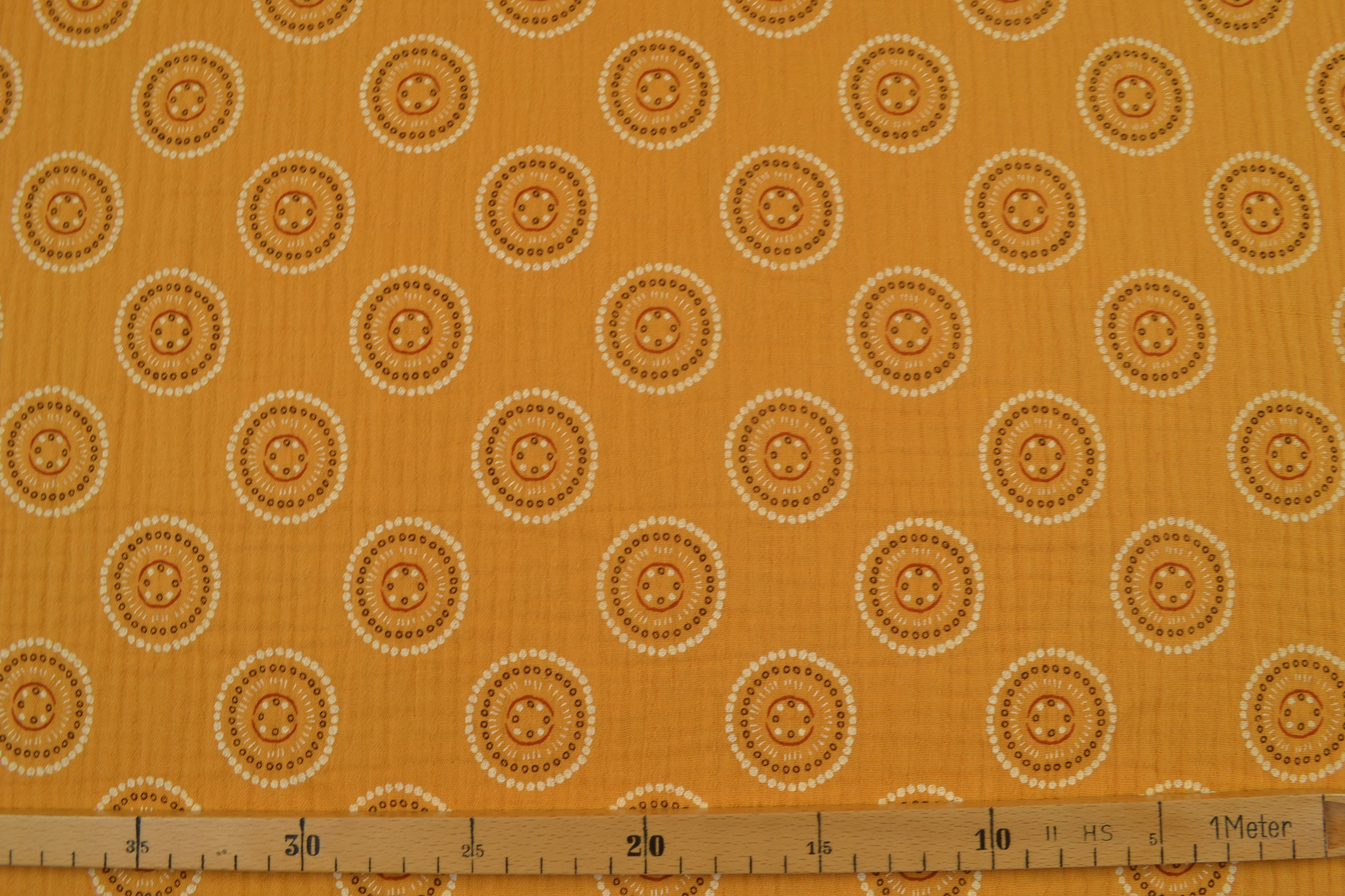 Baumwoll Musselin Double Gauze kleine Mandalas,senfgelb